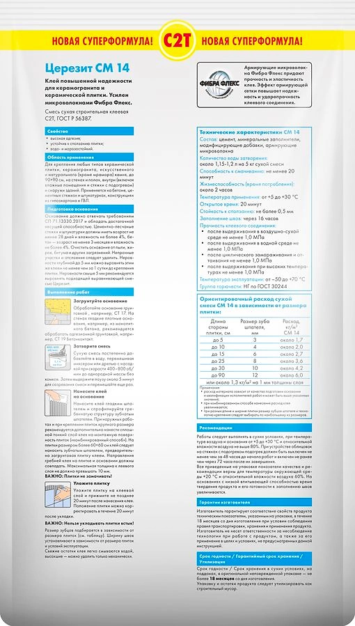 Клей СМ 14 Extra предназначен для крепления керамических, клинкерных и керамогранитных плиток, а также искусственного облицовочного камня на цементной основе, размером до 90x90 см, на стенах и полах,