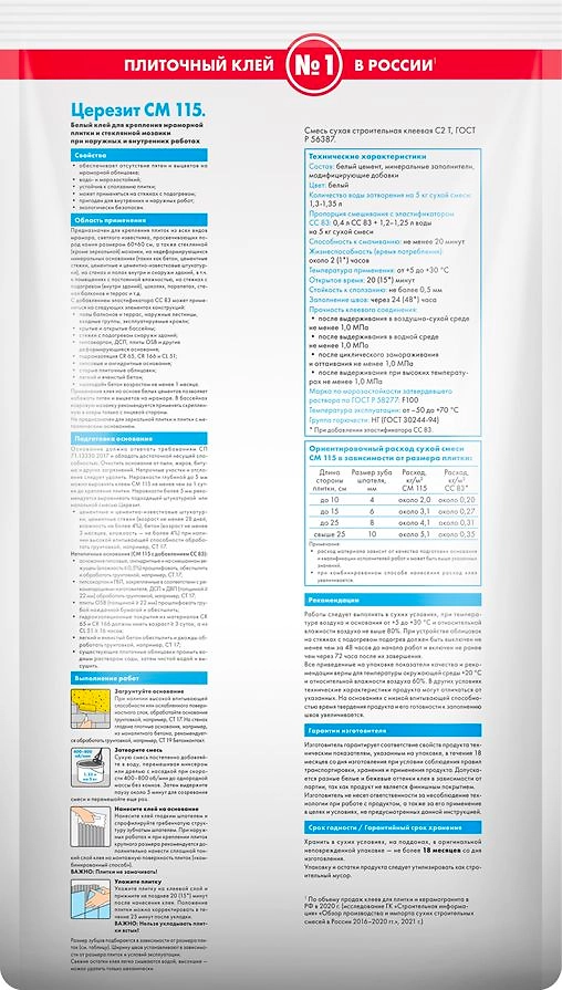 Клей СМ 115 предназначен для крепления плиток из всех видов мрамора, светлого известняка, просвечивающих пород камня, а также стеклянной мозаики, на недеформирующихся минеральных основаниях (таких