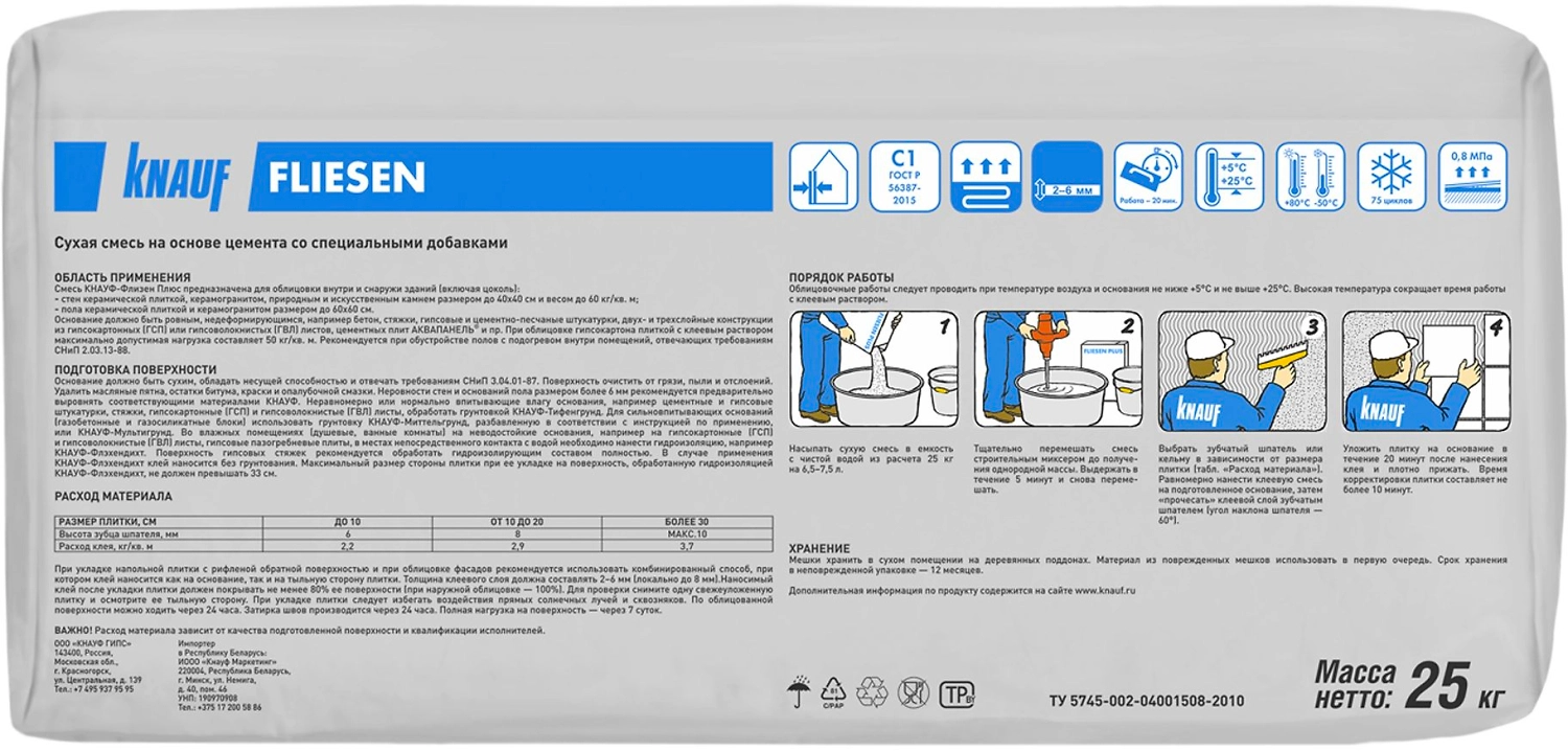 Плиточный клей цементный KNAUF Флизен Плюс 25 кг