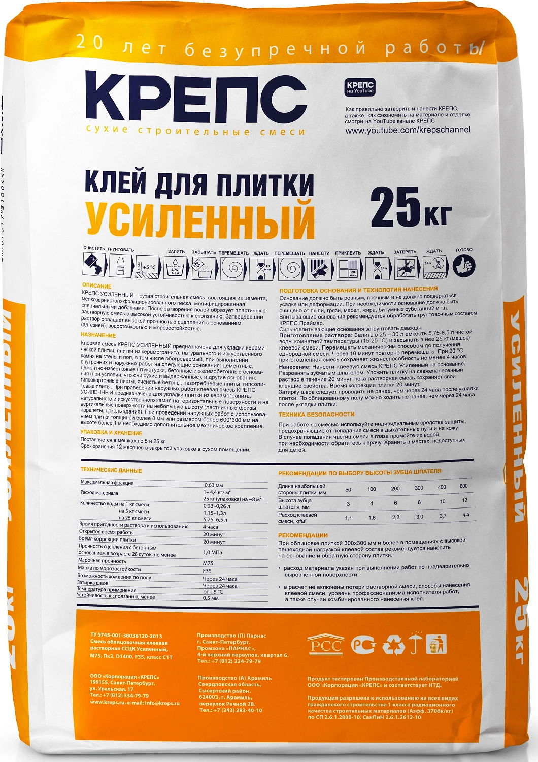 КРЕПС "Усиленный" – клей для керамической, клинкерной и керамогранитной плитки, плитки из искусственного камня. Сухая клеевая смесь на основе портландцемента, фракционированного кварцевого песка, модифицированная комплексом специальных добавок. Применяется для укладки керамической, клинкерной и керамогранитной плитки форматов не более 600\*600 мм, плитки из натурального и искусственного камня на строительные основания: бетон и железобетон; цементные стяжки; цементные, цементно-известковые штукатурки; ячеистые бетоны; гипсовые основания (гипсокартонные листы, пазогребневые и гипсолитовые плиты). Для облицовки стен и пола, в том числе обогреваемого. Применяется для наружной облицовки каминов. Для наружных и внутренних работ. Класс клея С1Т. Соответствует ГОСТ Р 56387-2018.