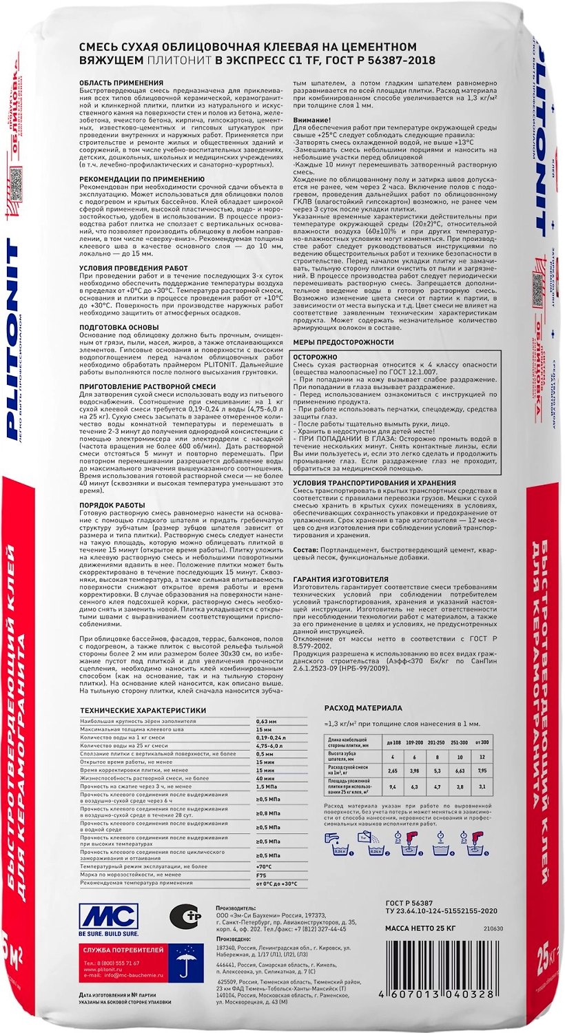 Применяется для укладки плитки из керамики, натурального и искусственного камня внутри и снаружи помещений. Возможность хождения и затирки швов через 2 часа. Прочность сцепления керамогранита с основанием не менее 1.0 МПа, открытое время работы составляет 15 минут, время корректировки - 15 минут. Возможность проведения работ от 0 град. Цельсия.