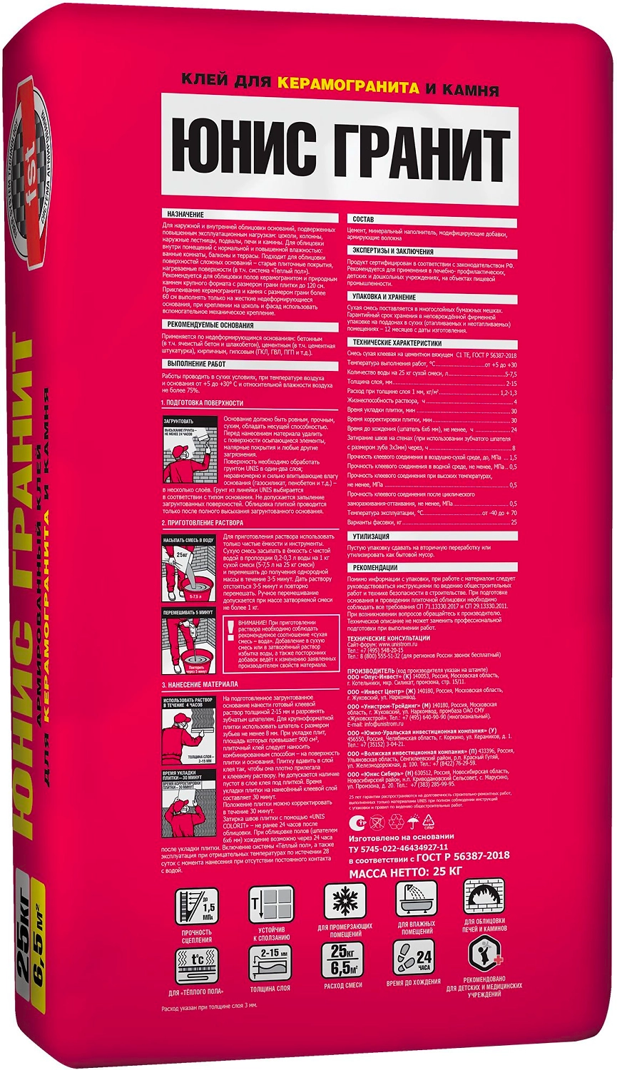 Клей Юнис Гранит, высокопрочный клей для плит большого размера и веса из природного камня и керамогранита. Используется для укладки тяжелых крупноформатных плит и плит среднего формата и веса из керамогранита, мрамора, натурального и искусственного камня при проведении внутренних и наружных работ.Облицовка оснований, подверженных повышенным эксплуатационным нагрузкам: цоколи, колонны, наружные лестницы. Для облицовки внутри помещений с нормальной и повышенной влажностью. Для ванных комнат, балконов и террас. Идеально подходит для облицовки поверхностей сложных оснований, таких как старые плиточные покрытия, нагреваемые поверхности и пр.