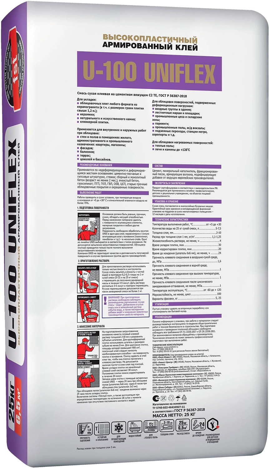 Высокопластичный плиточный клей U-100 Uniflex. Класс C2TE.
