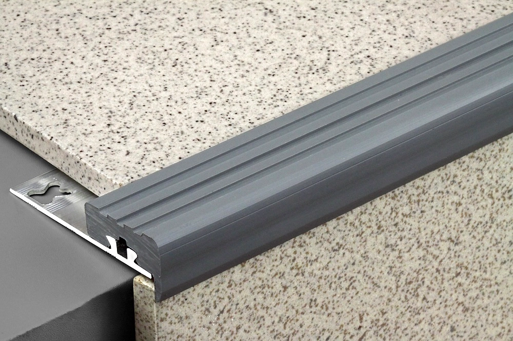 Внешний угол на ступень с ПВХ накладкой против скольжения и как элемент грязезащиты. Способ монтажа: устанавливается до момента укладки напольного покрытия на ступень, алюминиевая основа закладывается под напольное покрытие.