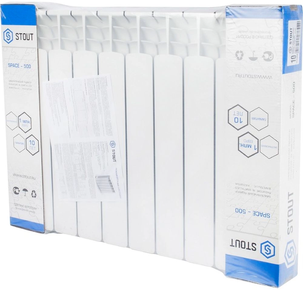 Биметаллический секционный радиатор STOUT Space 500, изготовленный из качественного алюминиевого сплава, разработан с учетом особенностей эксплуатации в России. Десять секций радиатора обеспечивают теплом помещения площадью 18 кв.м. Каждая секция - это стальная труба, залитая алюминиевым сплавом под давлением. Такая технология позволяет обеспечить высокие показатели рабочего давления.