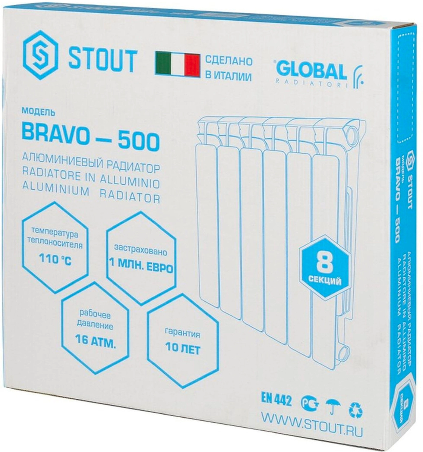 Радиатор секционный алюминиевый STOUT Bravo 500 боковое подключение 8 секций