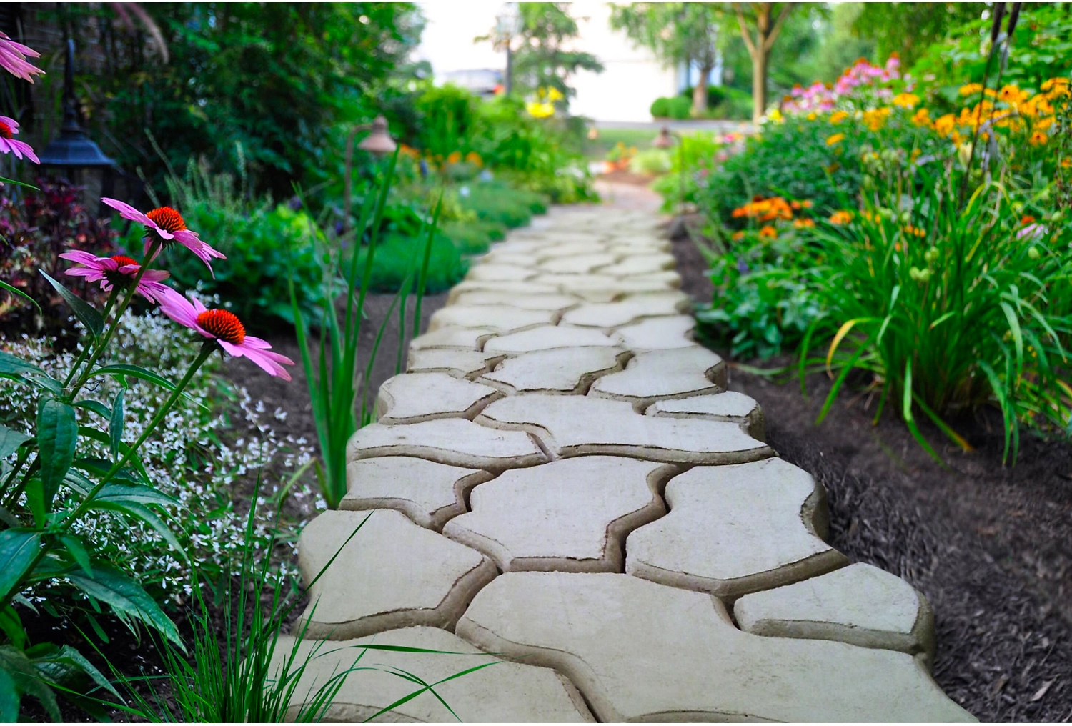 Предназначена для создания бетонных дорожек или площадок, конструкция позволяет стыковать получаемые плиты по любой стороне, увеличивая разнообразие "каменного рисунка" дорожки.