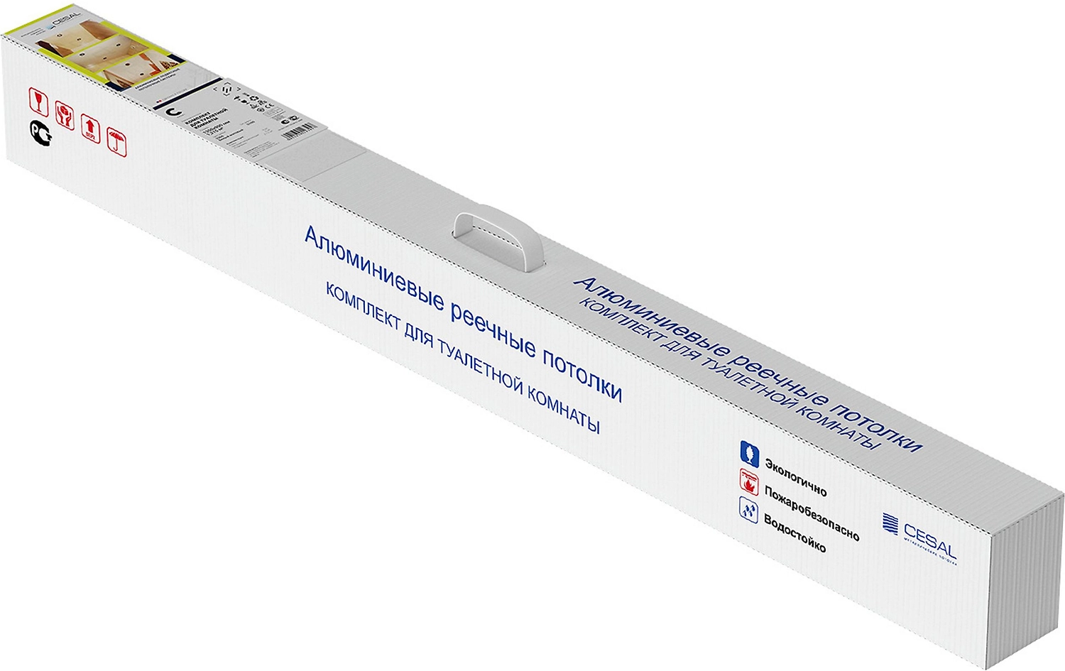 Набор реек CESAL представляет собой готовый комплект для монтажа подвесного реечного потолка в стандартном санузле 1,35х0,9 м.
