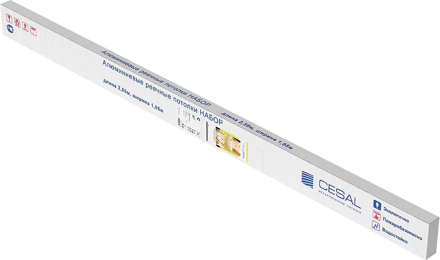 Набор реек CESAL состоит из семи матовых белых планок размером 250х15 см. Комплект подходит для создания подвесного потолка площадью 2,625 кв. метра. Несущие направляющие и другие комплектующие приобретаются отдельно, их количество рассчитывают в зависимости от геометрии помещения.