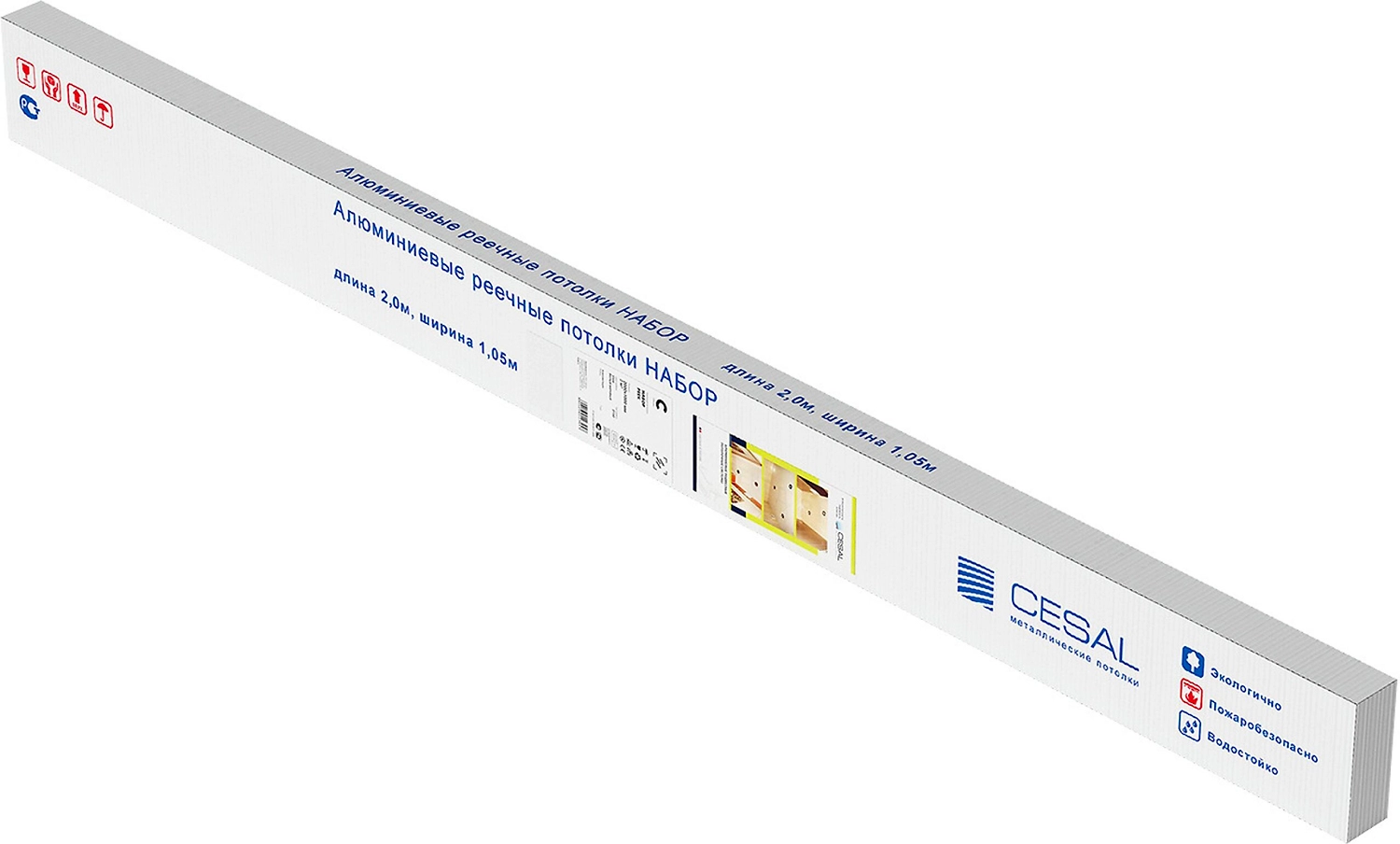 Набор реек CESAL состоит из семи двухметровых планок шириной 15 см. Элементы легко стыкуются, образуя ровное полотно потолка, без зазоров.