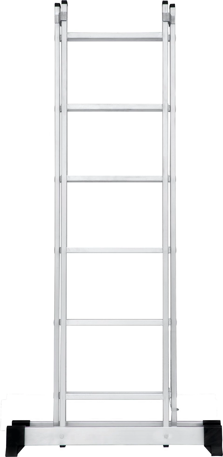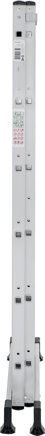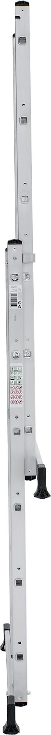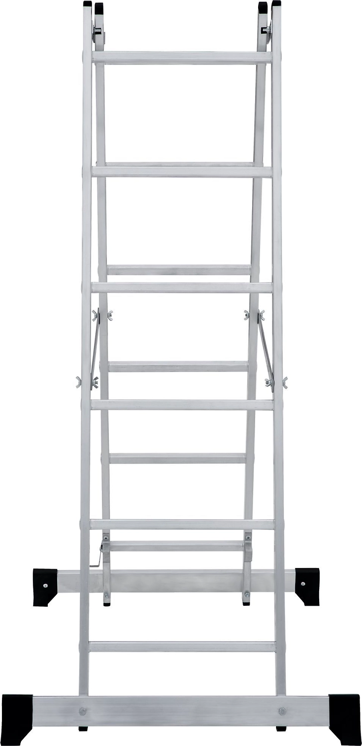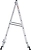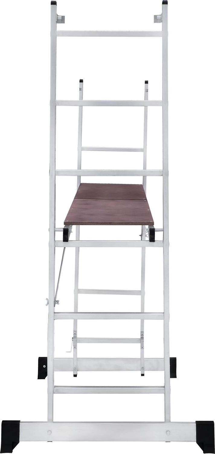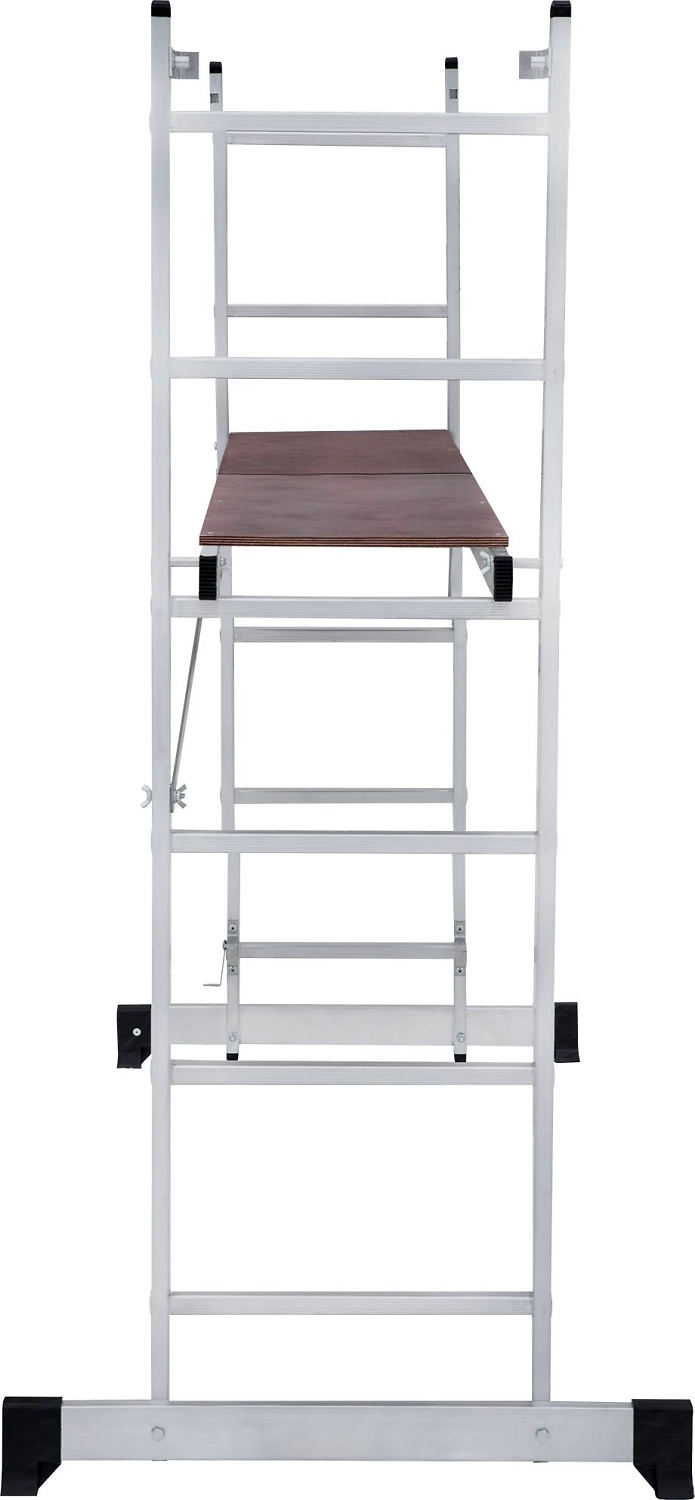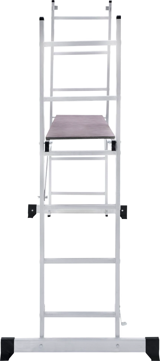 Лестница изготовлена из алюминиевого профиля. Может использоваться в качестве помоста или небольшой вышки. Пластиковые накладки на ножках препятствуют скольжению. Конструкция обладает хорошей устойчивостью и надежностью.
