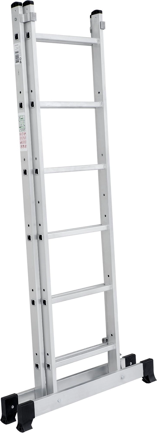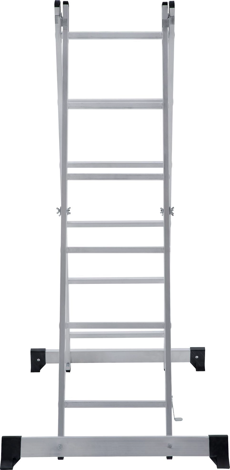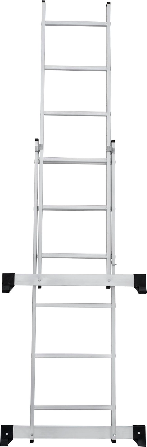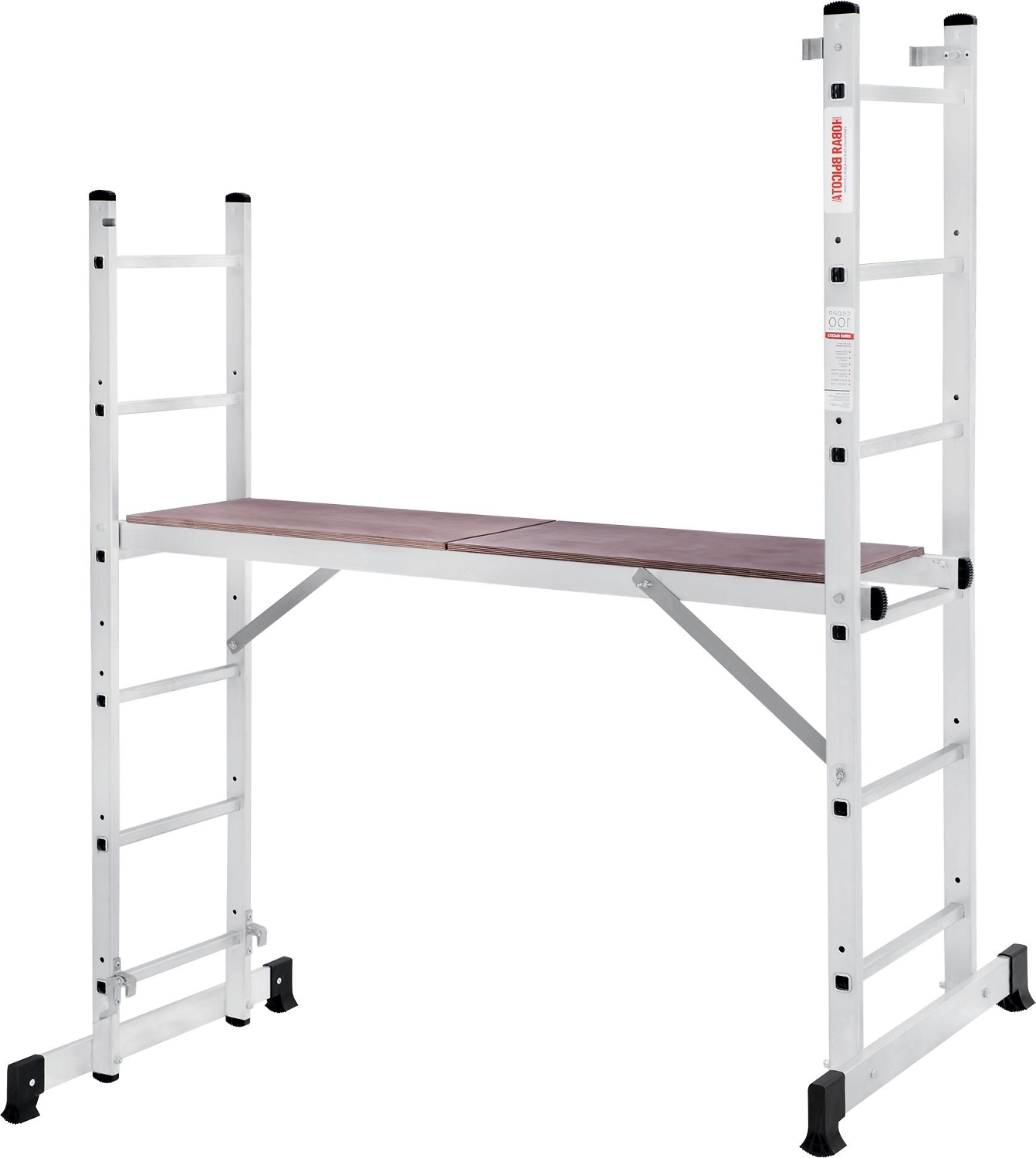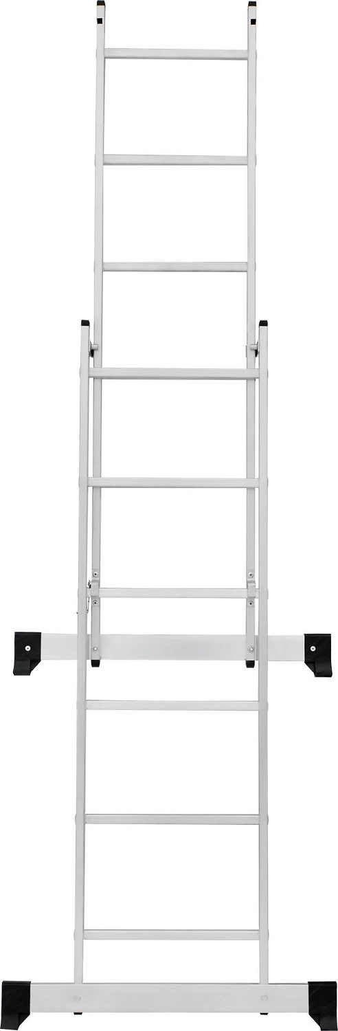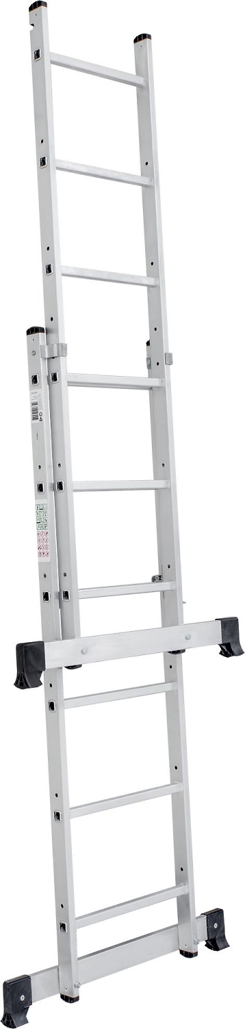 Лестница изготовлена из алюминиевого профиля. Может использоваться в качестве помоста или небольшой вышки. Пластиковые накладки на ножках препятствуют скольжению. Конструкция обладает хорошей устойчивостью и надежностью.