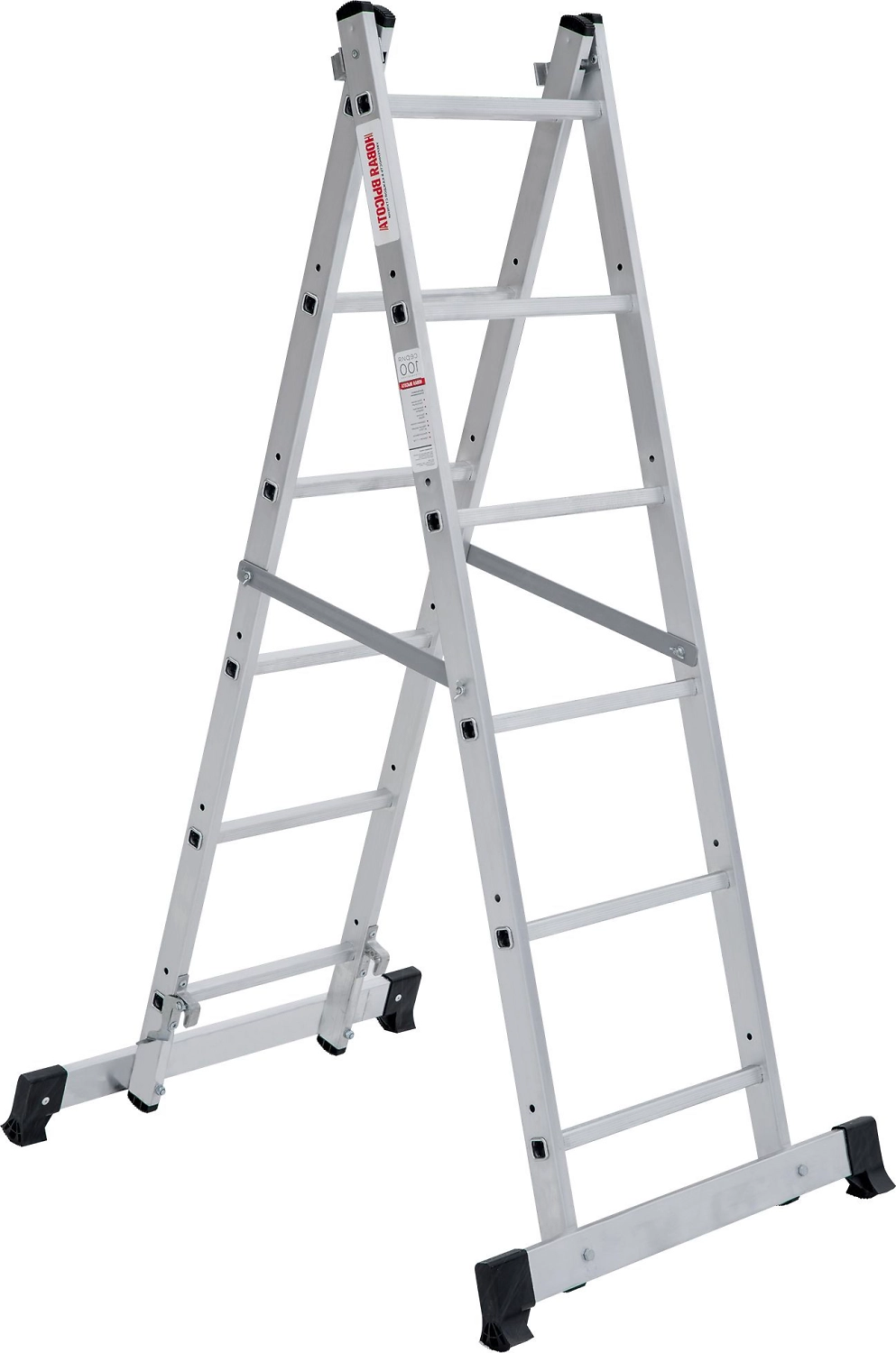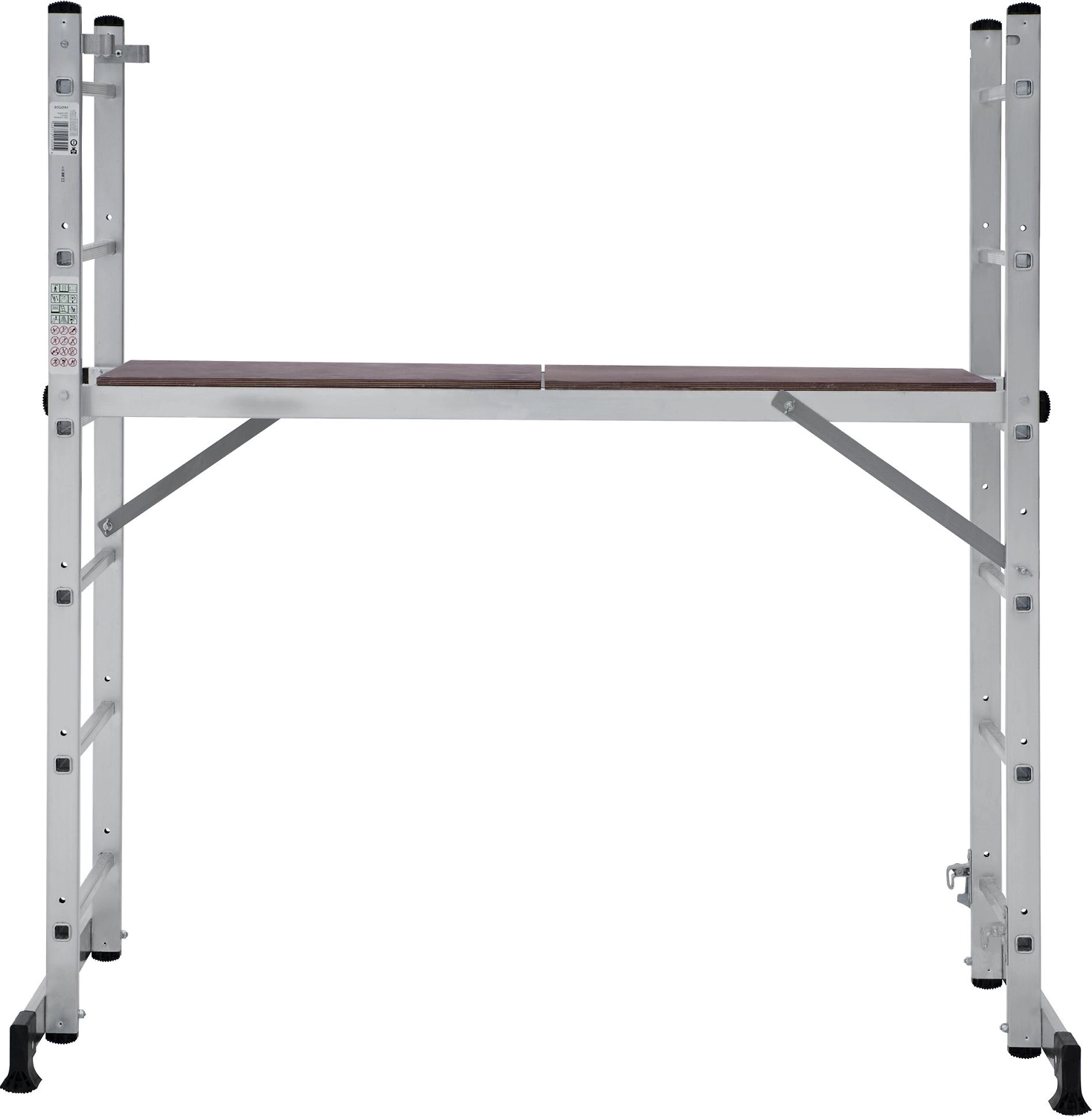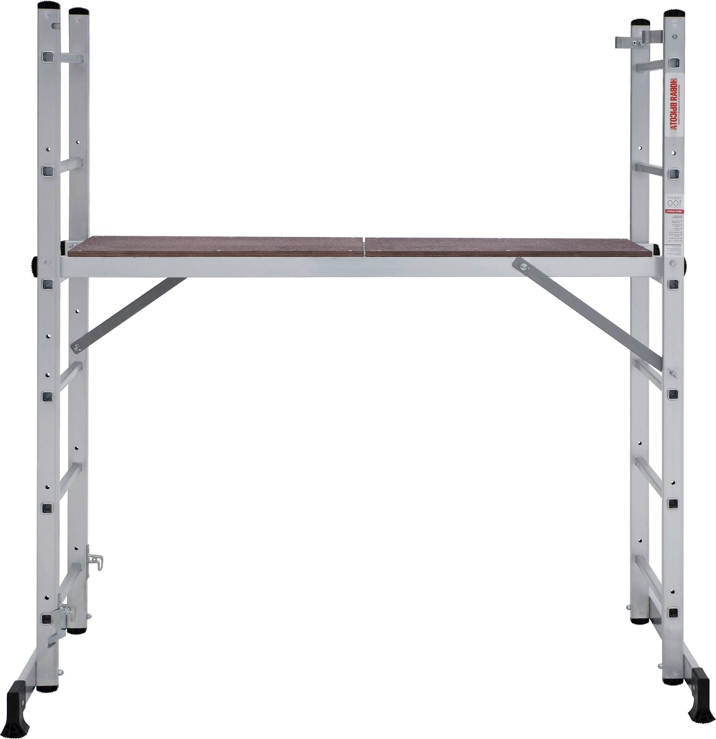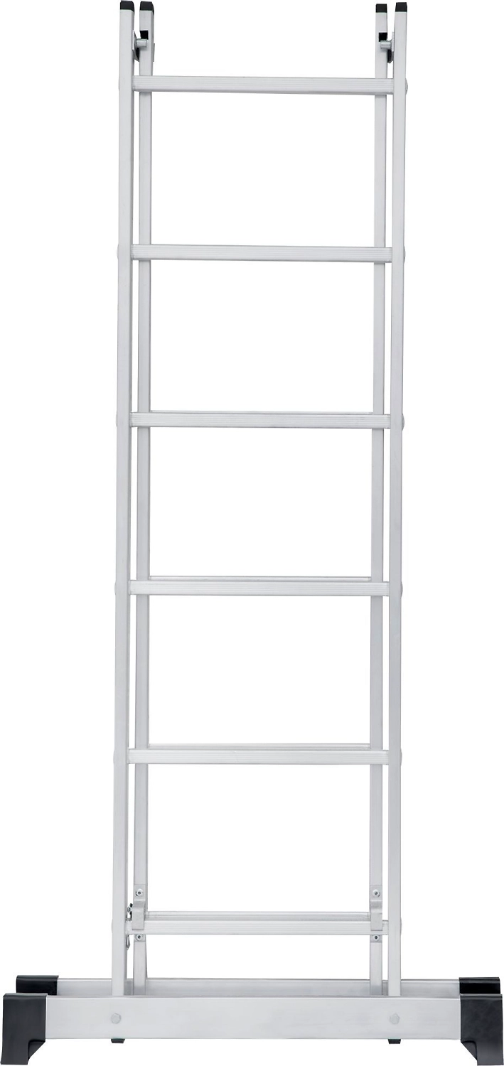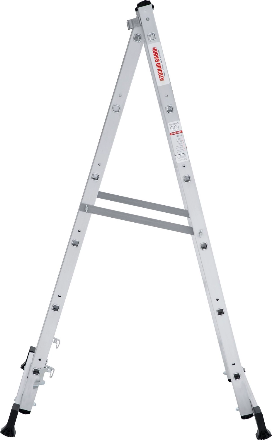 Лестница изготовлена из алюминиевого профиля. Может использоваться в качестве помоста или небольшой вышки. Пластиковые накладки на ножках препятствуют скольжению. Конструкция обладает хорошей устойчивостью и надежностью.