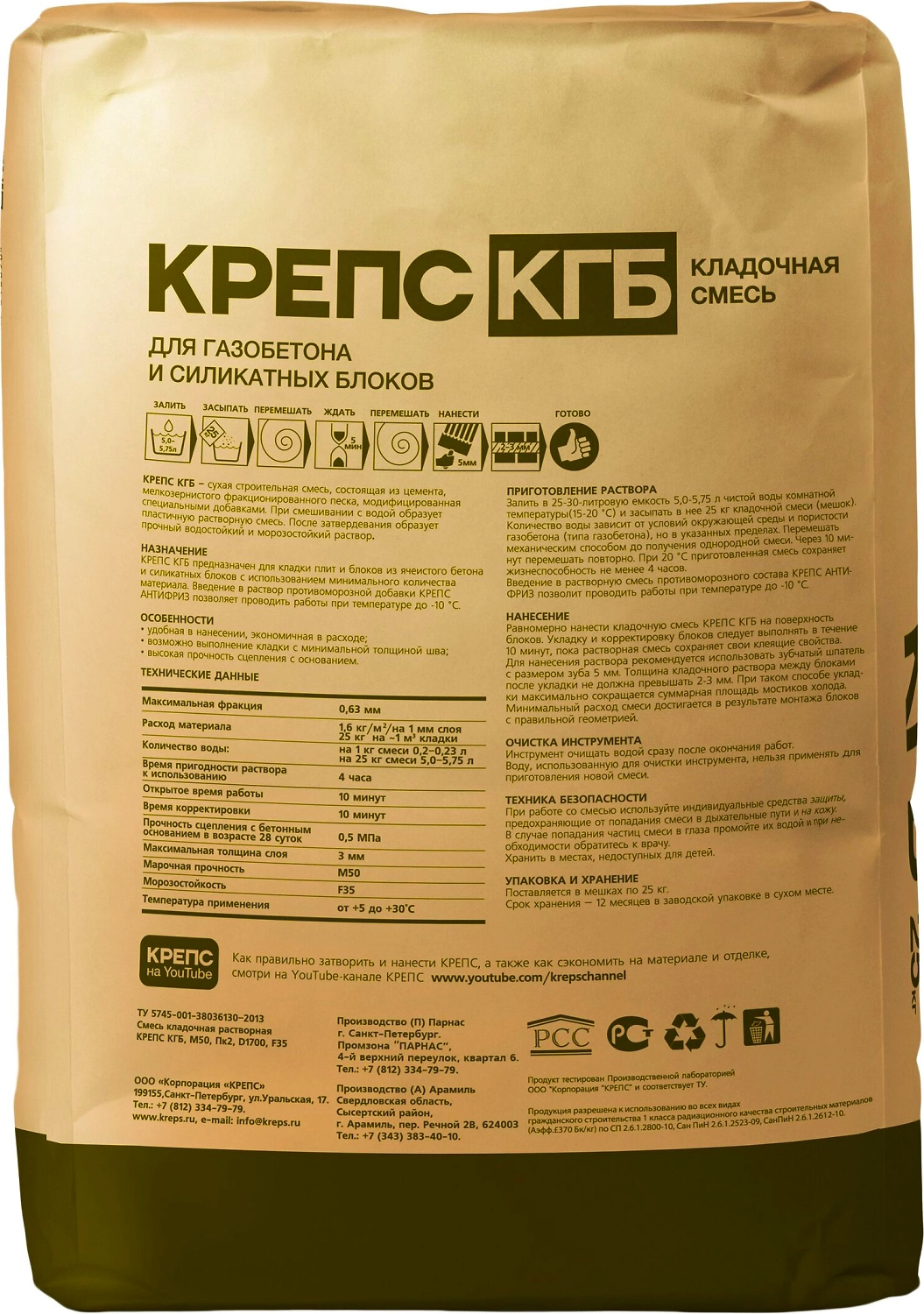 КРЕПС "КГБ" – сухая строительная сульфатостойкая кладочная смесь на основе портландцемента, фракционированного кварцевого песка, модифицированная специальными добавками. Обладает высокими эксплуатационными характеристиками. Смесь предназначена для тонкошовной кладки при возведении строительных конструкций из штучных материалов: блоки и плиты из ячеистого бетона; силикатные блоки. Для внутренних и наружных работ. Рабочая температура основания должна быть не ниже +5°С и не выше +35°С. Совместное применение с противоморозной добавкой КРЕПС АНТИФРИЗ позволяет проводить работы при температуре до - 10°С. Соответствует ГОСТ Р 58272-2018