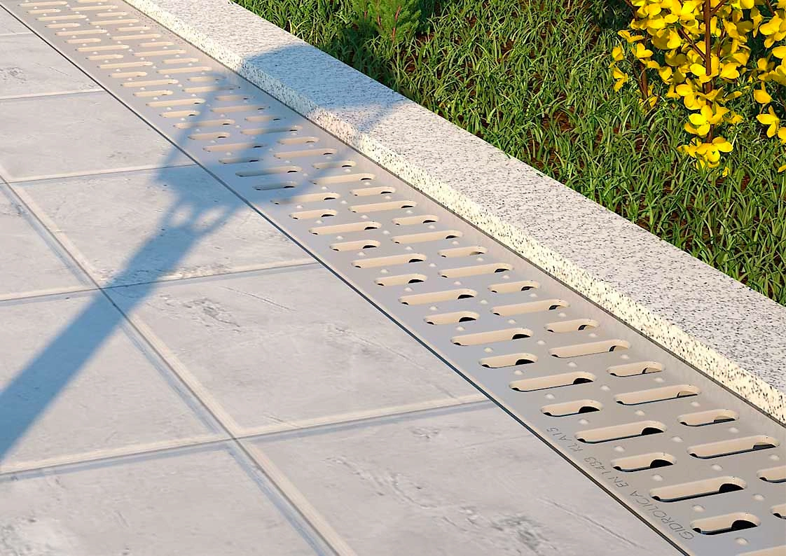 Комплект Gidrolica, состоящий из лотка и стальной оцинкованой решетки - готовое решение для строительства водоотвода от отмостки домов и в пешеходных зонах.