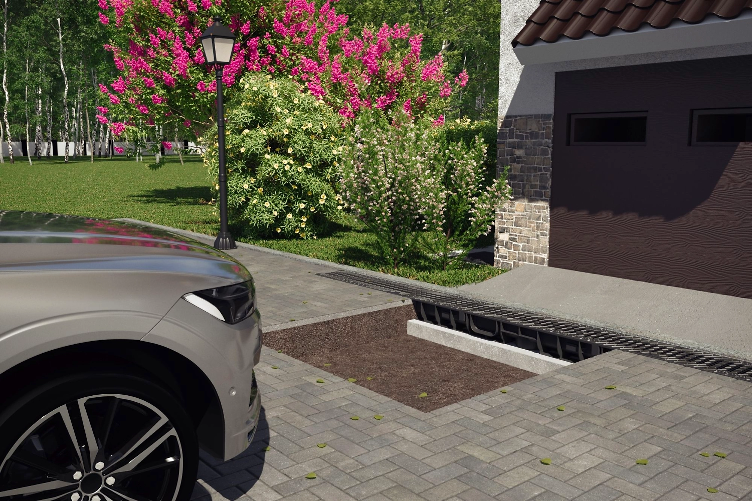 Лоток используется для создания системы ливневого водоотвода вдоль тротуаров, пешеходных и велосипедных дорожек, вокруг бассейнов, около гаражей и стоянок, в зонах индивидуальной застройки.