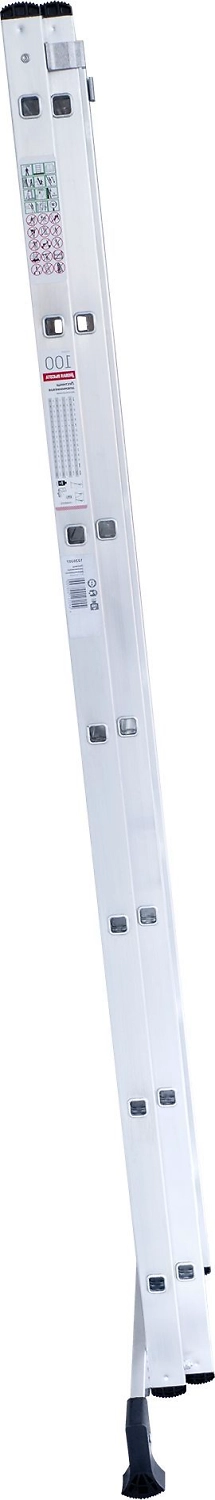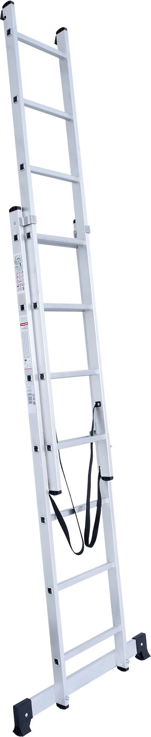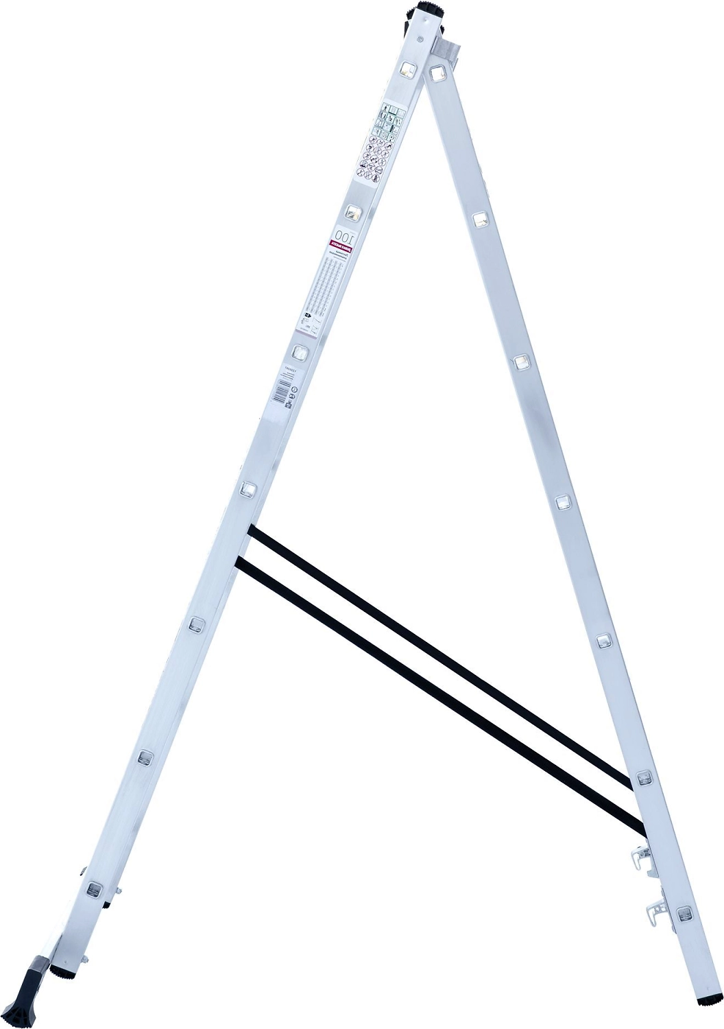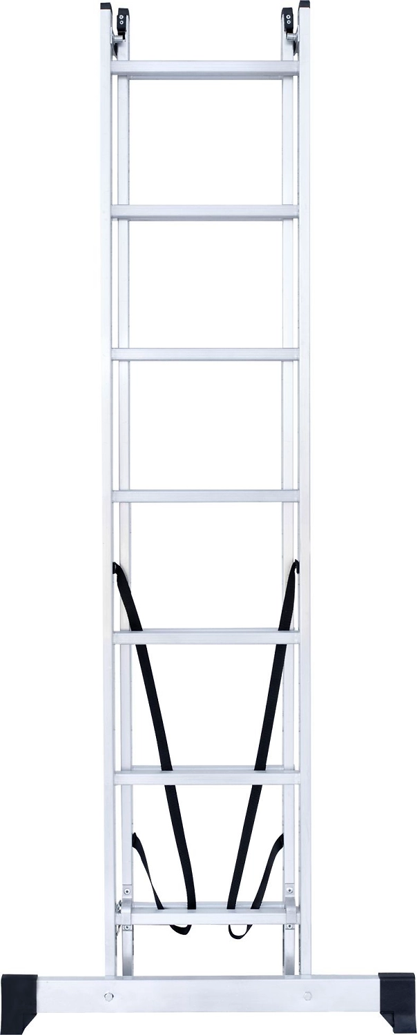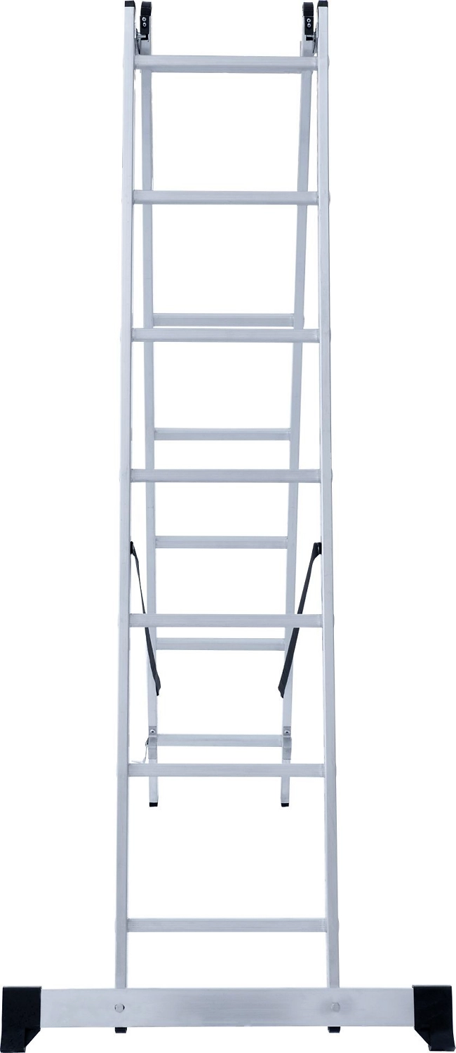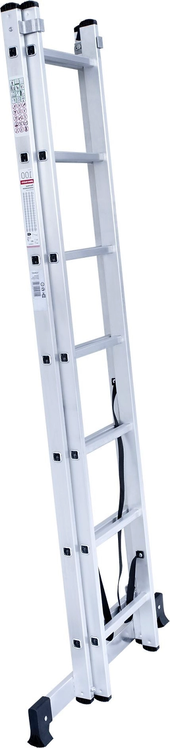 Алюминиевая раскладная двухсекционная лестница 2х7 ступеней стандартной серии предназначена для бытовых работ. Варианты использования: приставная лестница, приставная лестница с выдвижной секцией, двухсторонняя стремянка. Обладает высокой прочностью при небольшом весе.