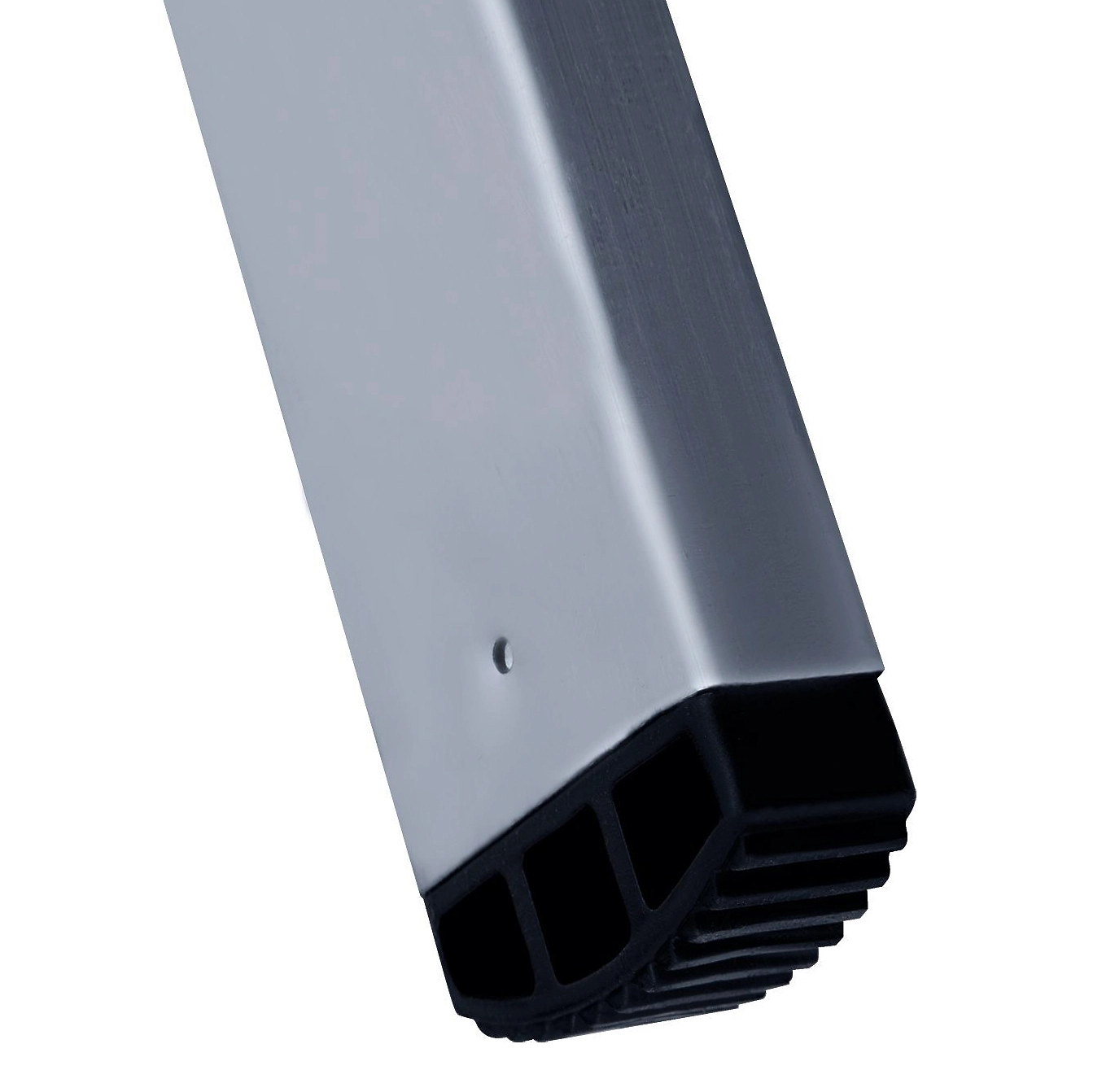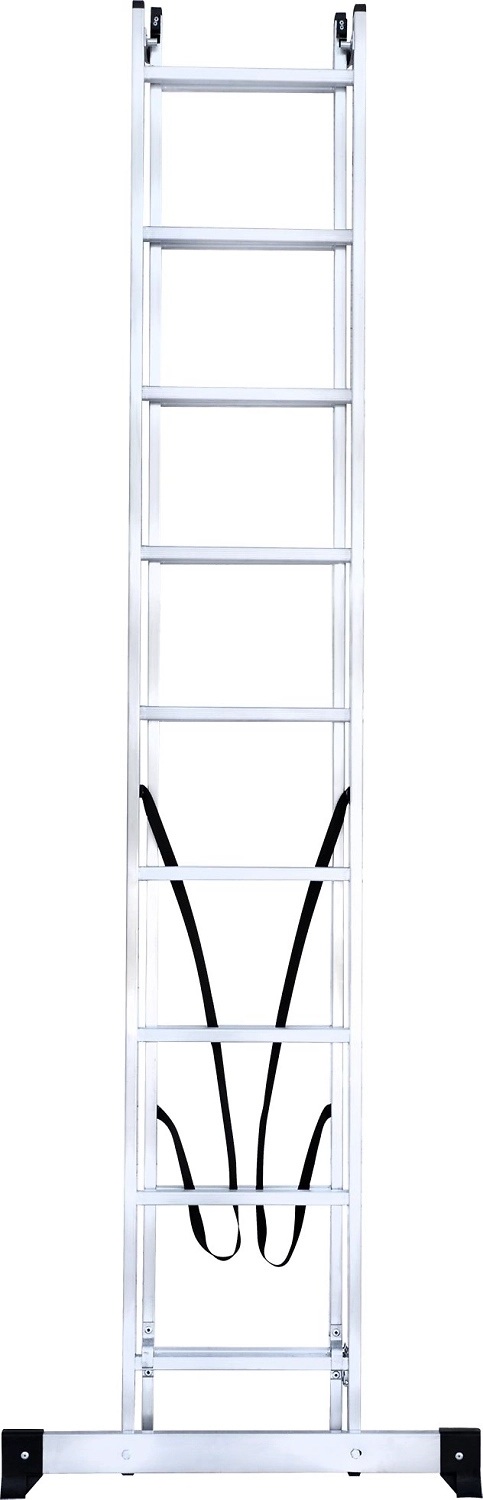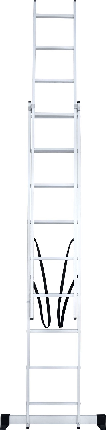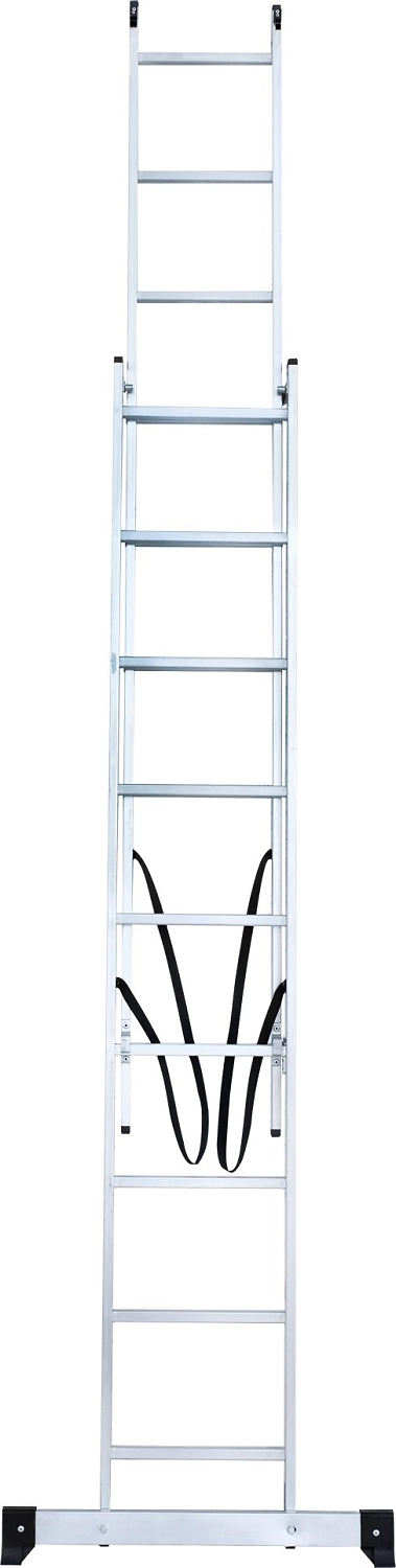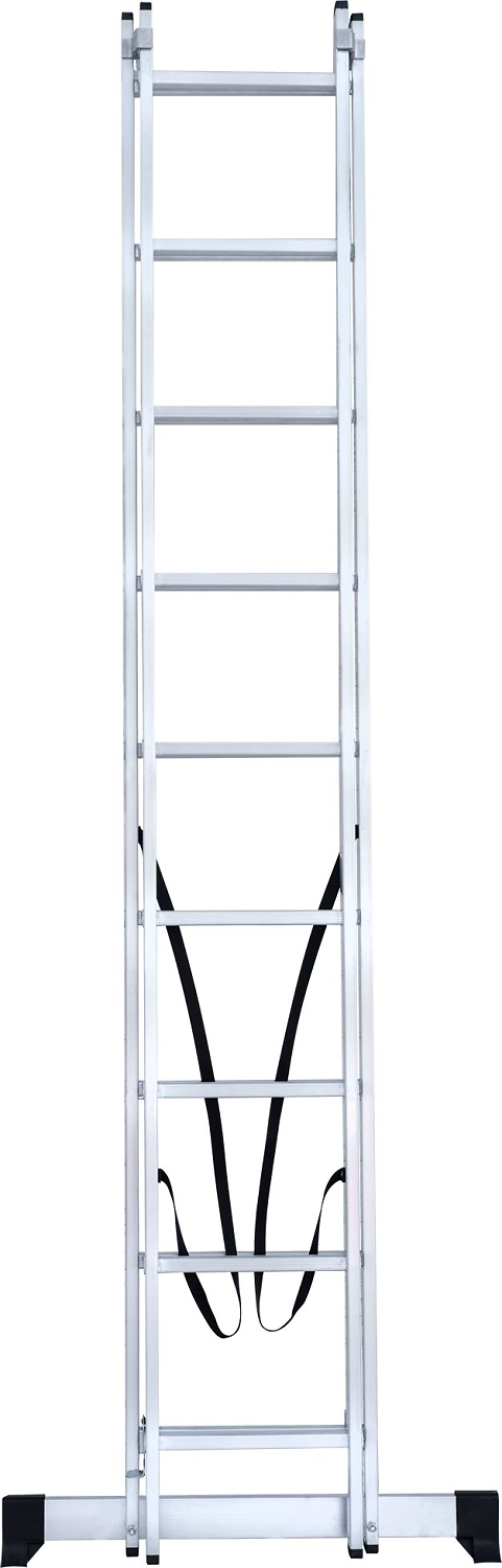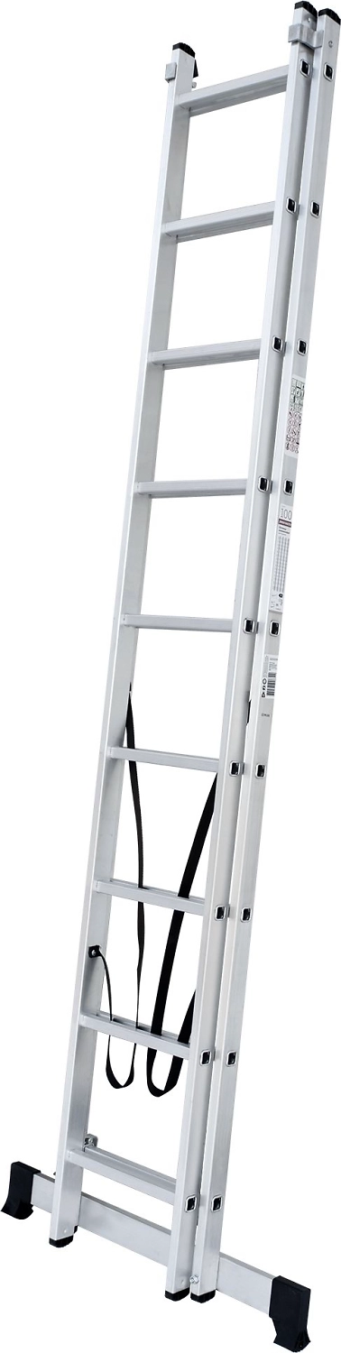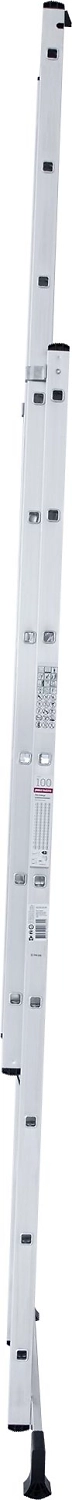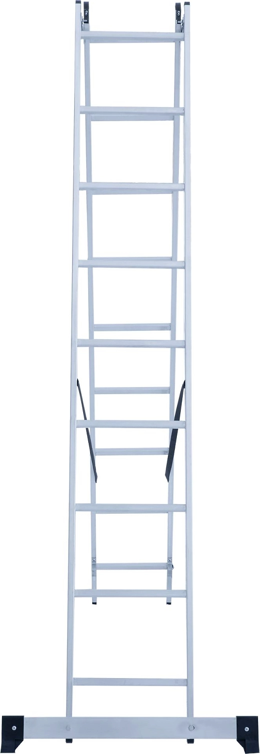 Раскладная лестница Новая Высота состоит из двух секций по девять ступеней с шагом 26 см. Выдвижная секция фиксируется в трех положениях с помощью направляющих кронштейнов. Практичная, продуманная конструкция из экструдированного алюминиевого профиля обеспечивает безопасность работы на высоте как в быту, так и в профессиональных целях.