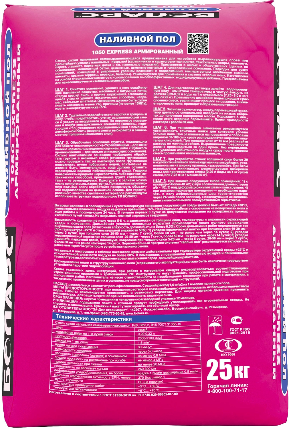Наливной пол Боларс EXPRESS 1050 предназначен как для тонкослойного нанесения, так и для выравнивания поверхностей со значительными перепадами уровней в жилых помещениях и общественных зданиях с нагрузкой на пол не более 200 кгс/см², с последующим креплением напольных покрытий (керамическая плитка, текстильные ковры, пластиковые покрытия, линолеум, паркет и др.). Применяется для устройства полов в помещениях с любым уровнем влажности (в т.ч. ванные комнаты, душевые, подвалы и т.п.), а также по основаниям, подверженным значительным температурным колебаниям (неотапливаемые крытые террасы и балконы, полы с подогревом) и повышенным эксплуатационным нагрузкам (склады, гаражи, промышленные помещения). Изготовлен с использованием высокоэффективных модифицирующих добавок. Предназначен для нанесения ручным и машинным способом.