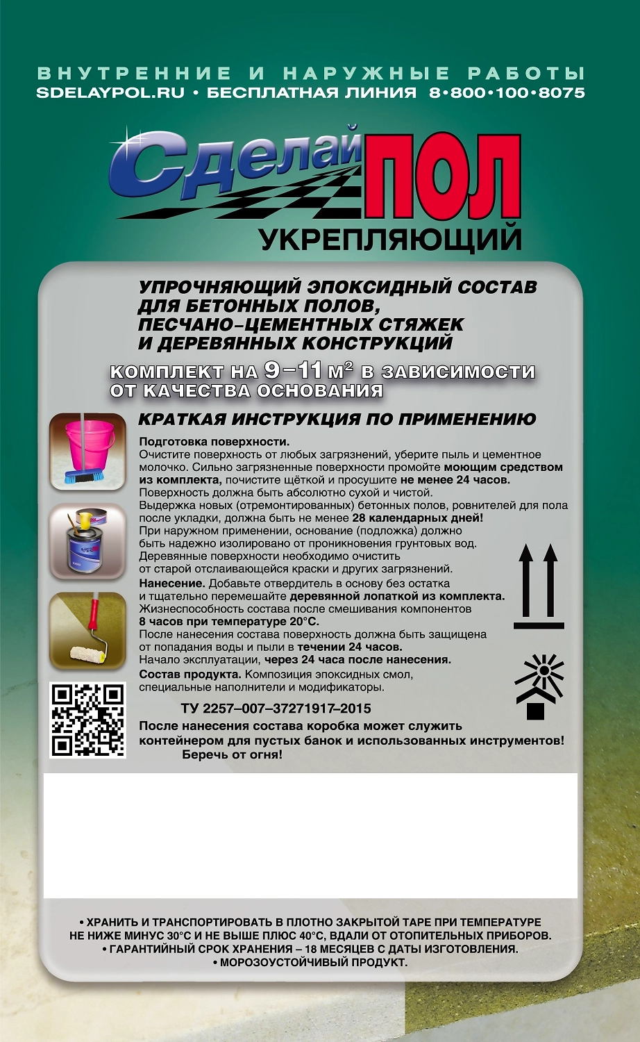 "Сделай ПОЛ Укрепляющий" - упрочняющий эпоксидный состав, предназначен для поверхностного укрепления бетонов, цементно-песчаных стяжек и других минеральных оснований (без образования или с частичным образованием пленочного слоя), допускается нанесение на деревянные конструкции и древесно-стружечные плиты. Проникая в толщу поверхности до 3 - 5 мм создает укрепленный слой, препятствует появлению пыли и проникновению грязи, масел, воды в обработанное основание, а также препятствует образованию на поверхности грибка и плесени.