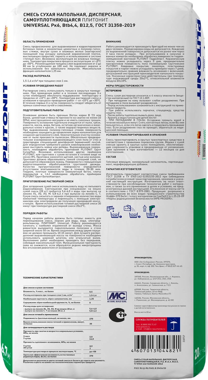 Ровнитель для пола минеральный PLITONIT Universal 20 кг