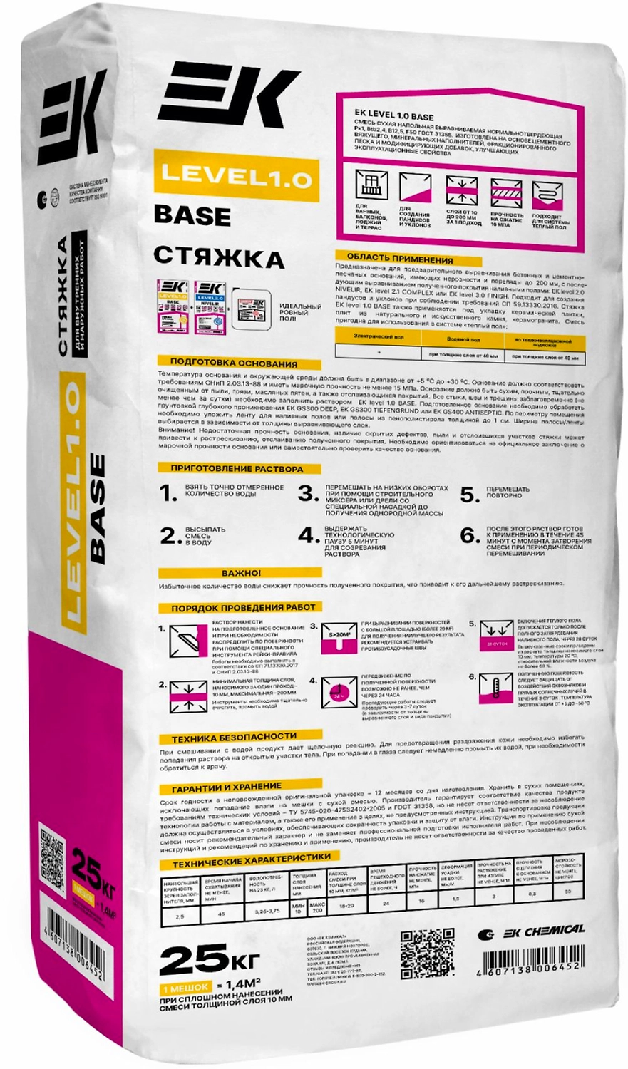 ЕК level 1.0 предназначена для предварительного выравнивания бетонных и цементно-песчаных оснований, имеющих неровности и перепады до 200 мм, с последующим выравниванием полученного покрытия наливным полом ЕК level 2.0, наливным полом ЕК level 2.1 или финишным наливным полом ЕК level 3.0 для внутренних и наружных работ в сухих и влажных помещениях.
