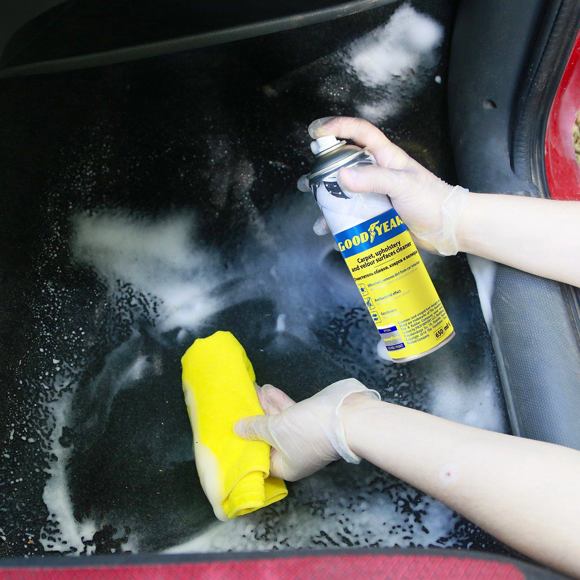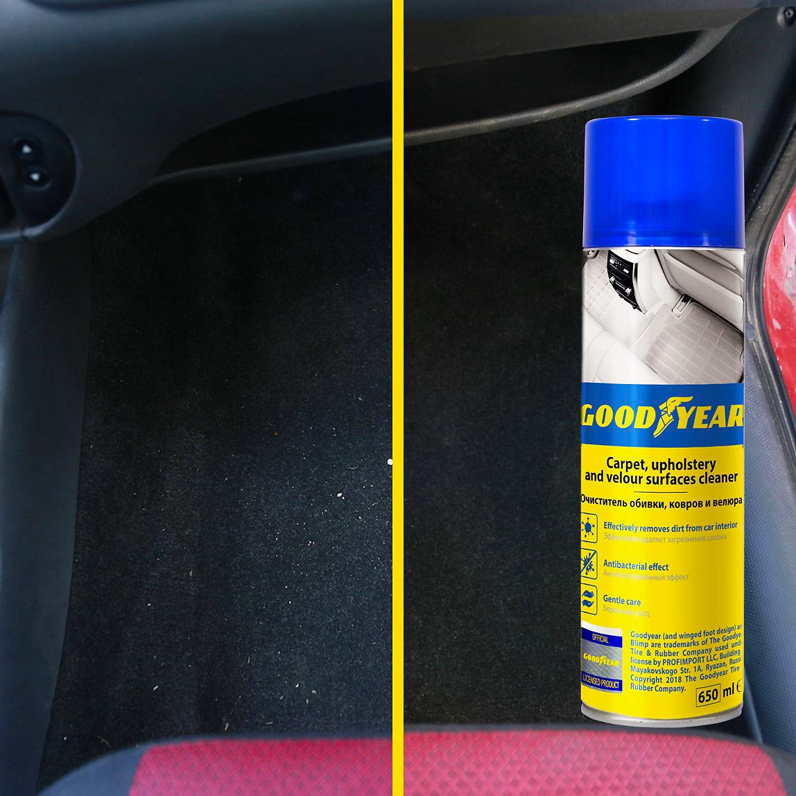 - Очищающее средство Goodyear обладает антибактериальным эффектом, что делает его незаменимым при обработке обивки после перевозки домашних животных, а также при покупке автомобиля на вторичном рынке.