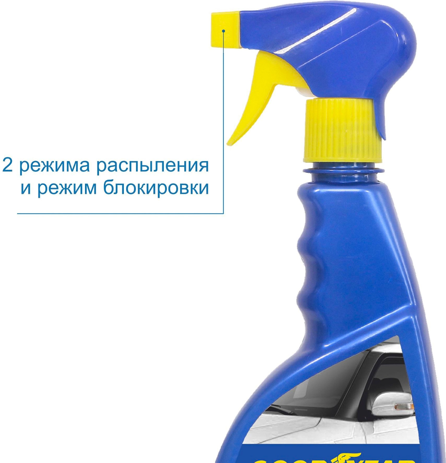 - Очиститель стекол от Goodyear позволяет быстро и эффективно удалить с поверхности стекол, зеркал и фар следы насекомых и другие загрязнения.