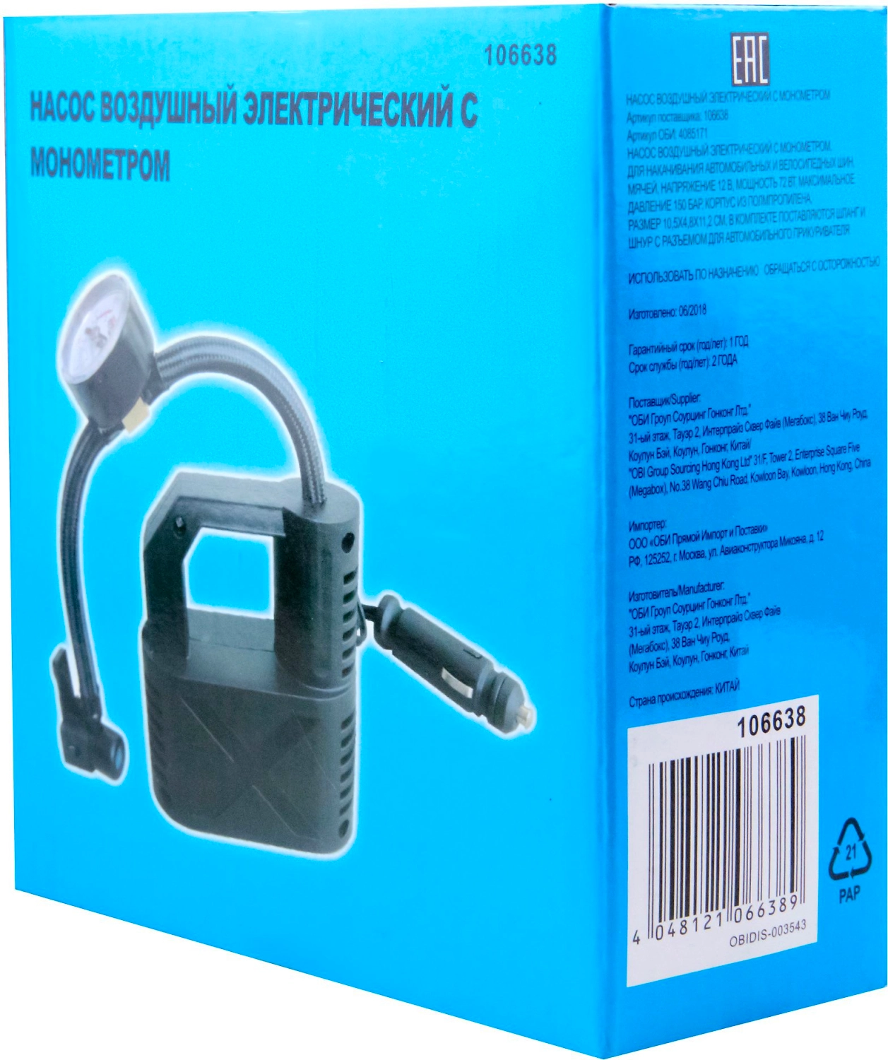 Насос воздушный электрический с манометром для накачивания автомобильных и велосипедных шин, мячей. Корпус выполнен из полипропилена. В комплекте шланг и шнур с разъемом для автомобильного прикуривателя.