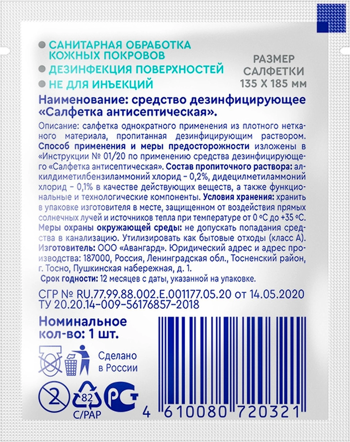 Антисептические салфетки, с антибактериальными свойствами для использования в целях личной гигиены, а также для применения в учреждениях (в том числе и медицинских), обладают антимикробным действием в отношении возбудителей острых респираторных заболеваний бактериальной и вирусной этиологии, бактериальных кишечных инфекций, ротавирусного гастроэнтерита, грибковых заболеваний. Предназначены для дезинфекции небольших поверхностей, санитарная обработка кожных покровов.