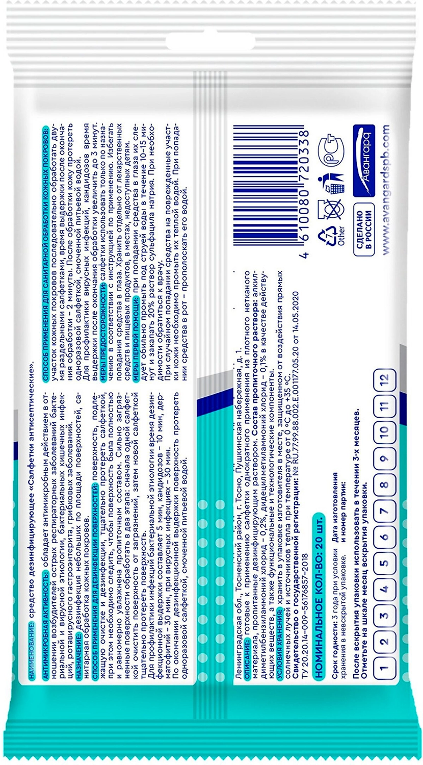 Антисептические салфетки, с антибактериальными свойствами для использования в целях личной гигиены, а также для применения в учреждениях (в том числе и медицинских), обладают антимикробным действием в отношении возбудителей острых респираторных заболеваний бактериальной и вирусной этиологии, бактериальных кишечных инфекций, ротавирусного гастроэнтерита, грибковых заболеваний. Предназначены для дезинфекции небольших поверхностей, санитарная обработка кожных покровов.