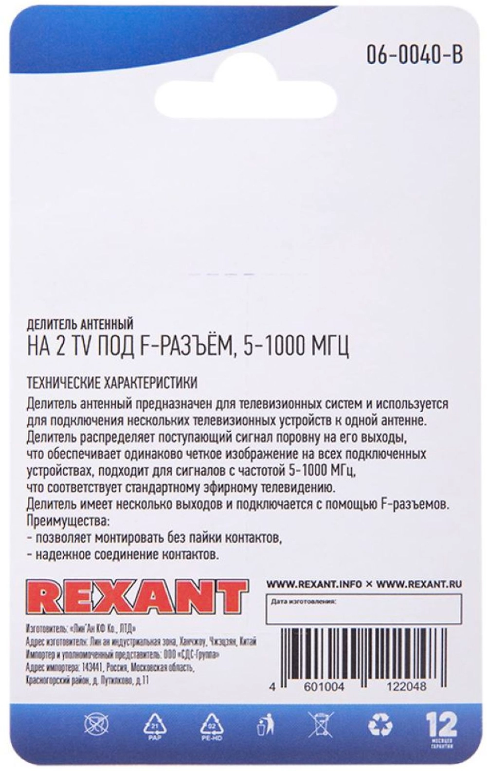 Делитель антенный REXANT F-типа на 2 TV, 5-1000 МГц