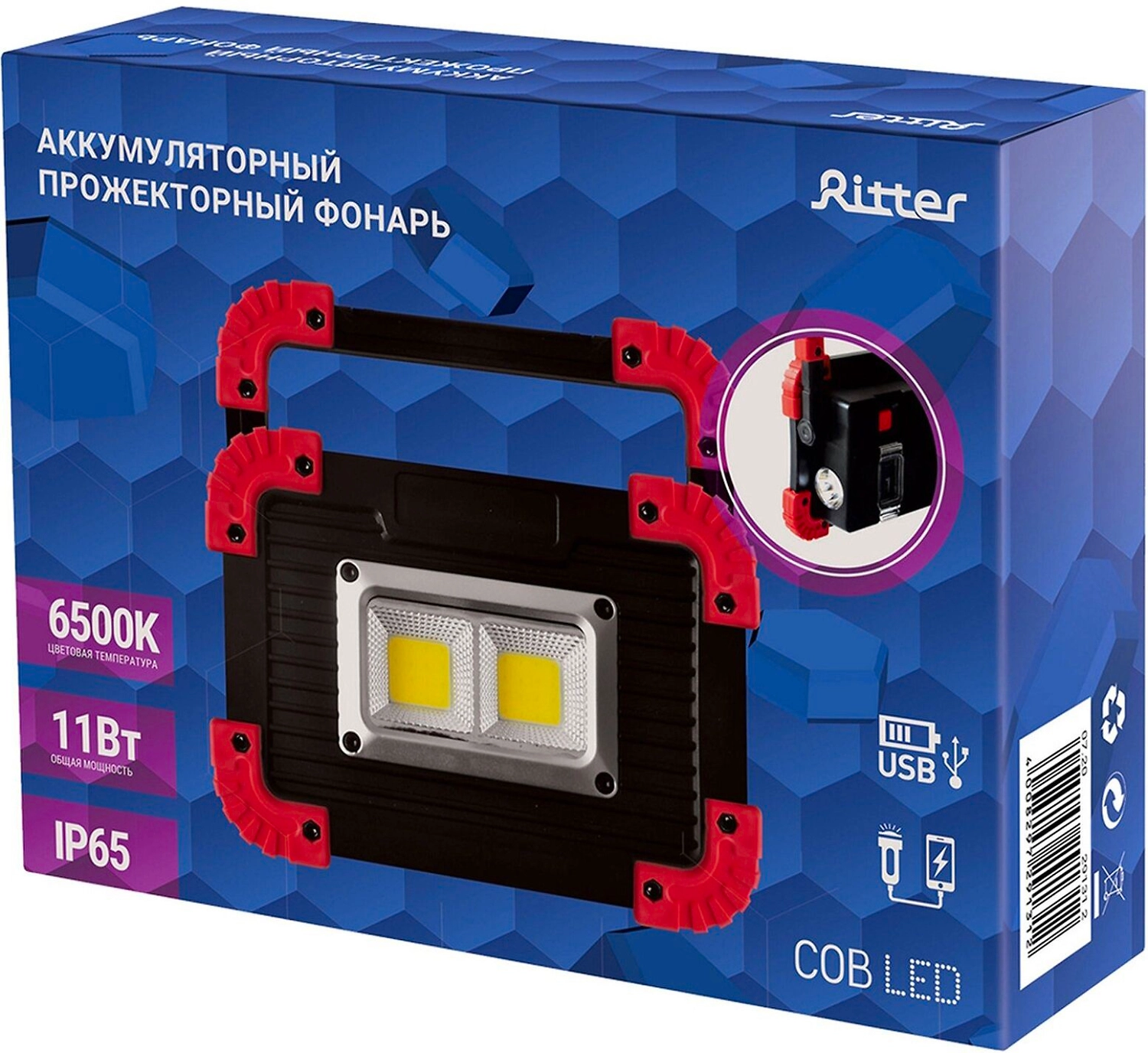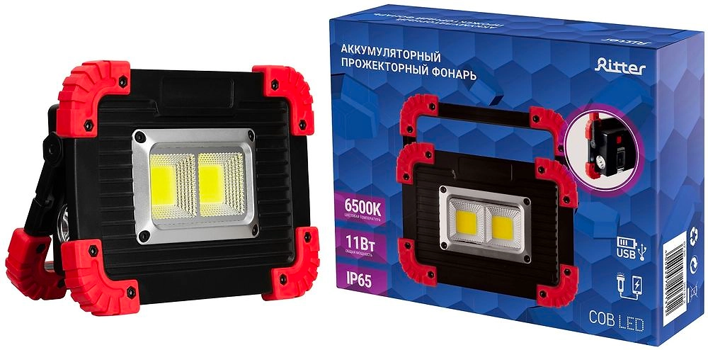 Корпус выполнен из прочного пластика, оборудован эргономичной регулируемой ручкой для переноски и установки в нужном месте. Аккумулятор обеспечивает непрерывную работу на протяжении до четырех часов. Прожектор можно заряжать через USB-порт или от трех батареек типа АА в комплект не входят , а также использовать в качестве внешнего аккумулятора для подзарядки мобильных устройств. Повышенная защита от влаги и пыли позволяет применять фонарь в самых экстремальных условиях.