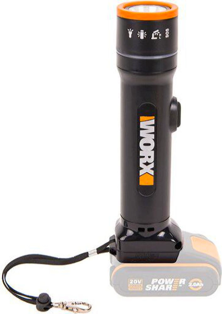 Аккумуляторный светодиодный фонарь WORX WX027.9 - 4 режима работы: классический фонарик, настольная лампа с двумя режимами работы (ночник и освещение на полной мощности), SOS сигнализация. Благодаря удобной телескопической ручке фонарик удобен при хранении и транспортировке. Поворотная головка 0-140 град. направляет луч в нужное место. Батарея POWERSHARE 20 В взаимозаменяема с другими инструментами WORX. Поставляется без АКБ и ЗУ