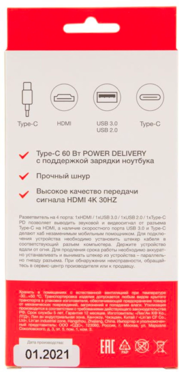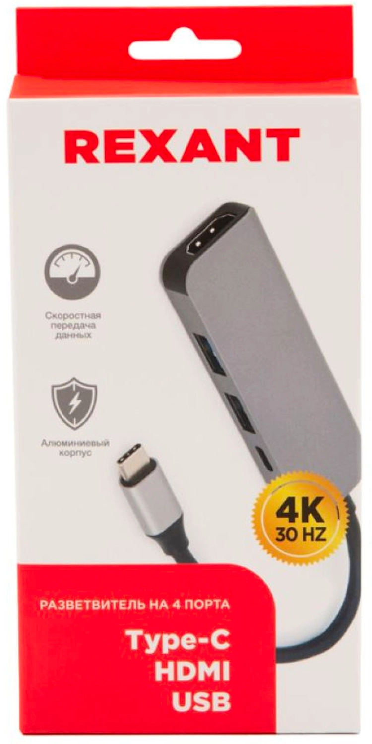Разветвитель USB Type-C на 4 порта: 1xHDMI/2xUSB 3.0 PD/1xType-C PD REXANT позволяет выводить звуковой и видеосигнал от разъема Type-C на HDMI, а наличие скоростных портов USB 3.