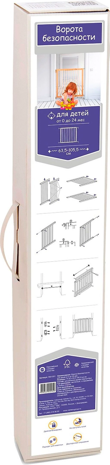 Ворота безопасности предназначены для детей от 0 до 24 мес. Устанавливаются в дверные или лестничные проемы шириной от 63,5 до 103,5 см. Изготовлены из экологически чистого матерала. Имеют европейский стандарт качества. Не требуют смазки. Загрязнения удаляются водой и мягким моющим средством.