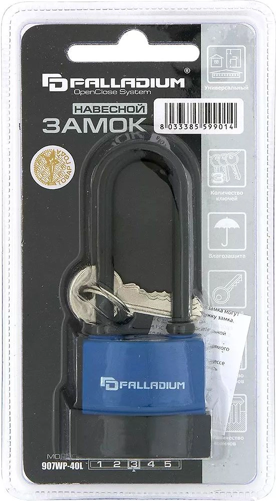 Всепогодный навесной замок 40 мм с длинной дужкой. Прекрасно работает в любую погоду благодаря водонепроницаемой конструкции. Высокий проем дужки (52,7 мм) позволяет завести замок через высоко приваренные расположенные или широко расставленные петли.