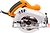 Пила оснащена современным щеточным двигателем 1200Вт. Мощность двигателя позволяет раскручивать диск диаметром 160мм до 5000 оборотов в минуту. Электрическая конструкция пилы не производит вредных выбросов и отлично подходит для использования в мастерской. В качестве источника питания используется сеть 230В.