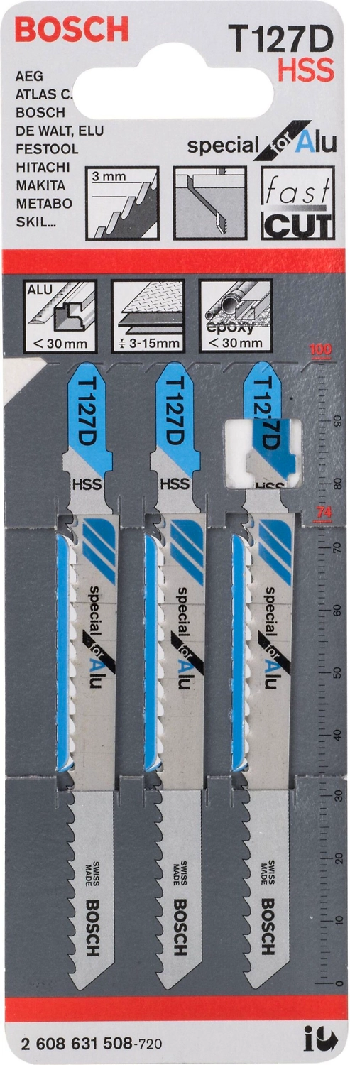 Лобзиковое пильное полотно T 127 D Special for Alu позволяет выполнять быстры прямые пропилы в металле. Геометрия разведенных зубьев с крупными овальными углублениями предназначена для быстрых пропилов. Полностью закаленное полотно из высококачественной быстрорежущей стали подходит для пиления алюминия и цветных металлов. Средний прогрес. шаг зубьев (3,0 мм) для листов алюминия толщиной 3-15 мм, алюминиевых труб и профилей диам. до 30 мм