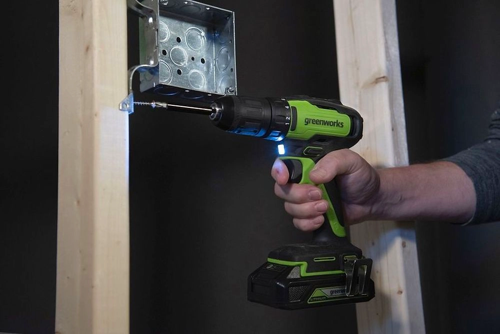 Двухскоростная дрель-шуруповерт Greenworks GD24DD35 с плавной регулировкой крутящего момента и реверсом работает от универсального аккумулятора, который может использоваться с любым инструментом