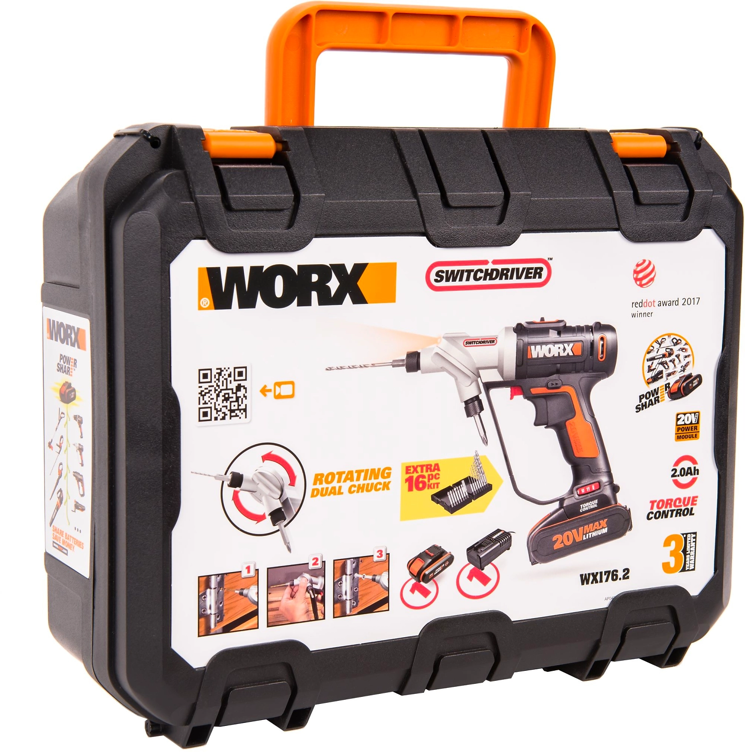 Дрель-шуруповерт Worx Switchdriver WX176.2 - это экономия времени, комфортная работа и высокая производительность. Компактный размер и удобный защитный кейс позволяют защитить инструмент от влаги и пыли при хранении. Набор оснастки из 16 сверл дает возможность приступить к работе сразу после покупки.