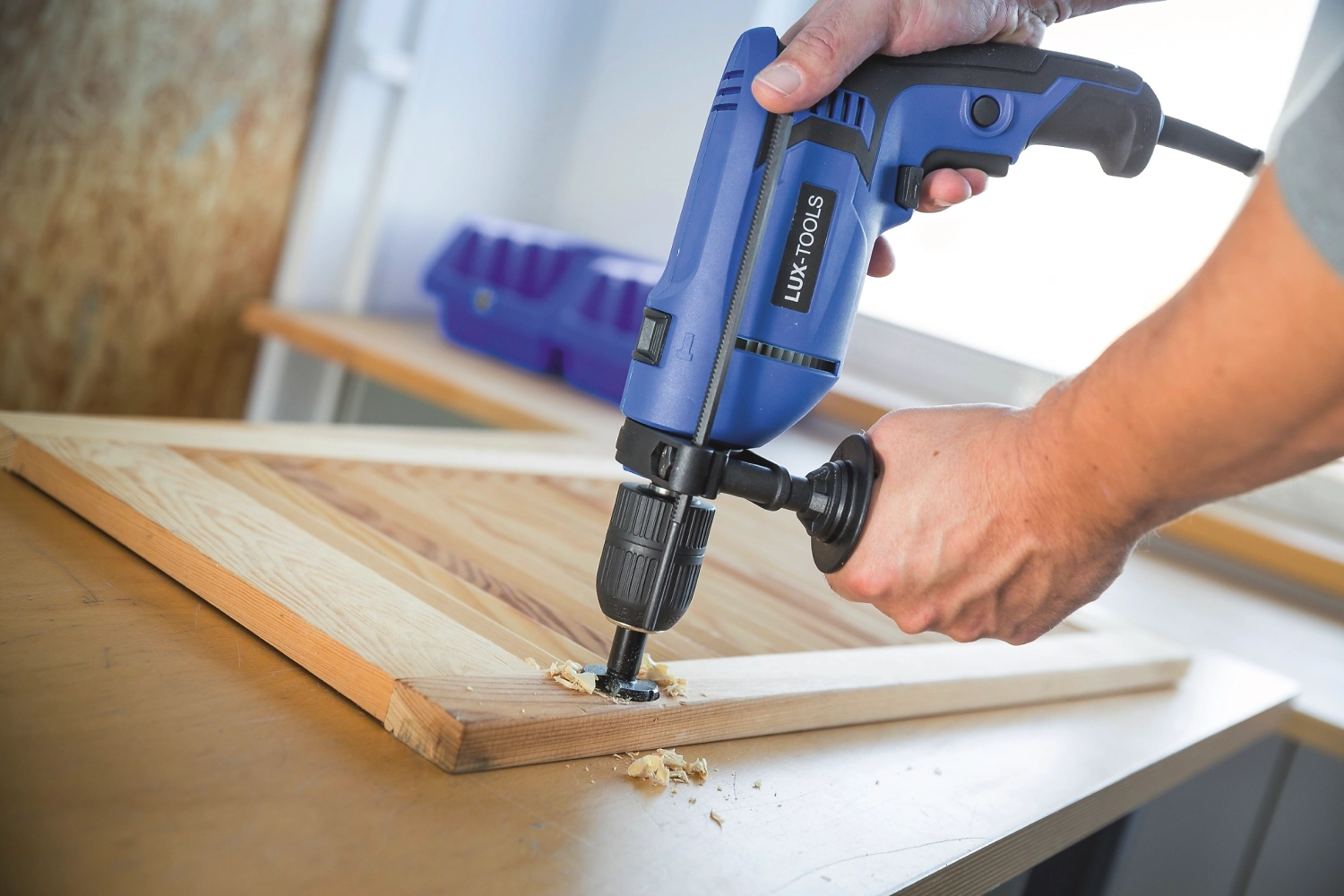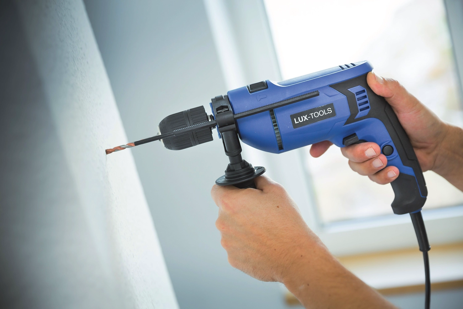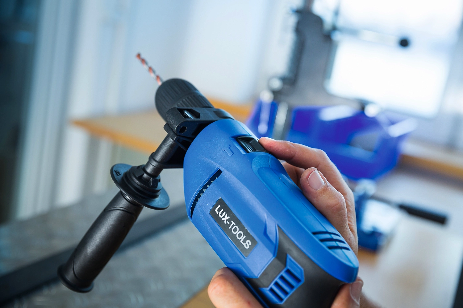 Дрель ударная LUX-TOOLS 750 Вт сверлит различные поверхности. В ударном режиме инструмент производит не только вращательные, но и толкательные движения, поэтому подходит для работы с бетоном, камнем, кирпичом. В безударном режиме дрель используется для сверления древесины, керамики, металла, пластика и других материалов, а также для закручивания и демонтажа винтов.