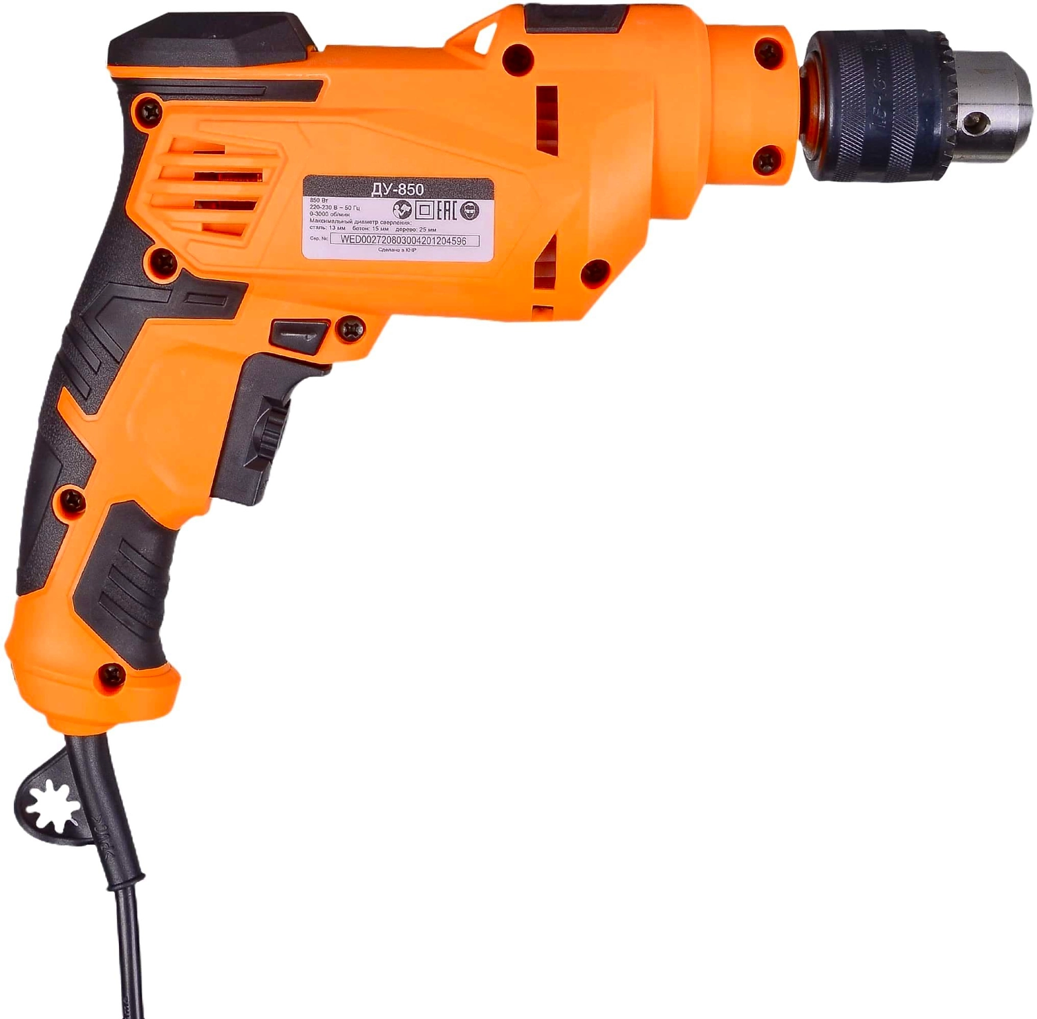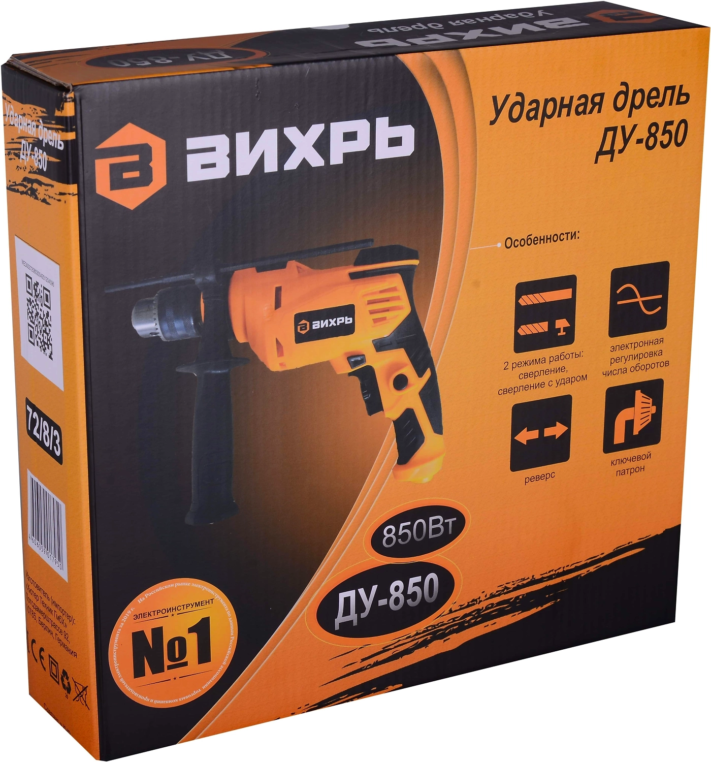 **Ударная дрель ВИХРЬ ДУ-850** электрический инструмент, предназначенный для сверления отверстий в различных материалах, а так же заворачивания/отворачивания винтов и шурупов, при проведении строительных, отделочных, столярных, слесарных и других работ. Помимо сверления дрель может быть использована для заворачивания/отворачивания винтов и шурупов. Также, с дрелью могут быть применены различные насадки для шлифования и отрезания, в случае возможности закрепления в патрон дрели. Все дрели оснащены ударным механизмом. Эта функция облегчает сверление бетона или кирпичной кладки.
