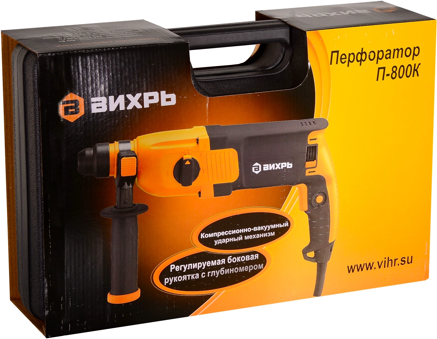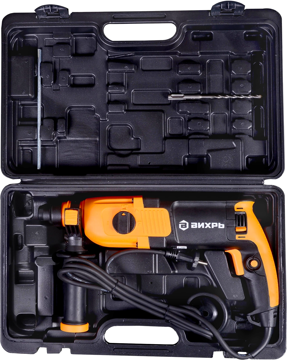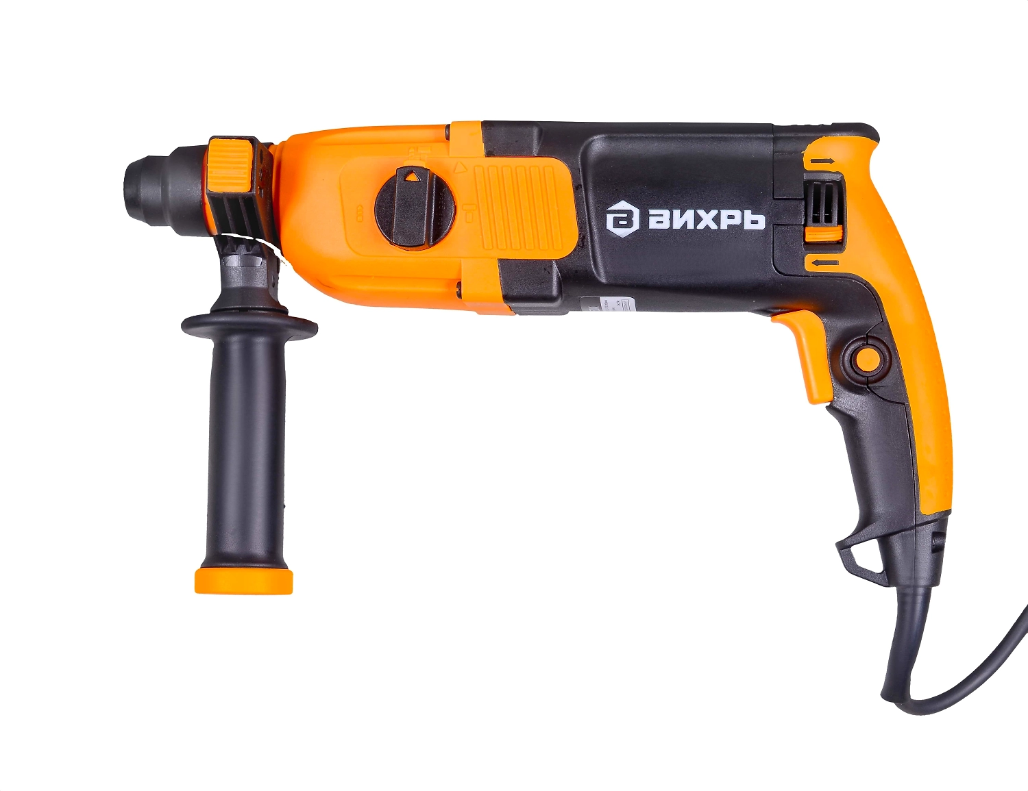 **Перфоратор ВИХРЬ** - электроинструмент, аналогичный дрели, но с наличием не механического, а пневматического ударного механизма. Именно поэтому перфоратор используют для сложных работ по твёрдым материалам - бетону, кирпичу, металлам. Агрегат используется для сверления и пробивания отверстий в прочных материалах без приложения особых физических усилий со стороны оператора. Принцип работы перфоратора - это разрушение обрабатываемого материала с помощью поступательных и вращательных действий рабочего элемента. Состоит перфоратор из электрического двигателя, редуктора, ударного механизма и патрона для крепления рабочих инструментов (буры, коронки, зубила и т.д.).