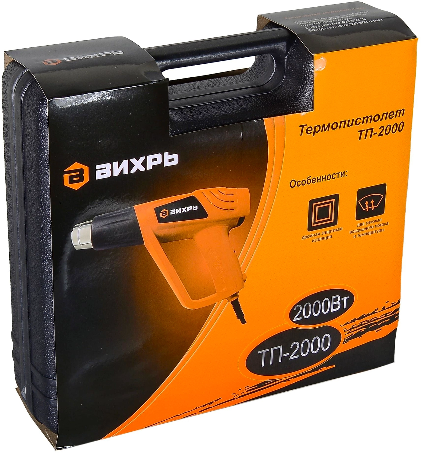 **Термопистолет (фен промышленный) ВИХРЬ ТП-2000** - ручной электроинструмент для обработки горячим воздухом поверхностей и материалов, для удаления красок, формования и сварки пластмассы, нагревания термоусадочных труб инструмент также подходит для пайки и лужения, размягчения клеевых соединений (швов), а также размораживания водопроводных труб. Термопистолет предназначен для эксплуатации при температуре окружающей среды от -10°С до +40°С, относительной влажности воздуха не более 80% и отсутствии прямого воздействия атмосферных осадков и чрезмерной запылённости воздуха.