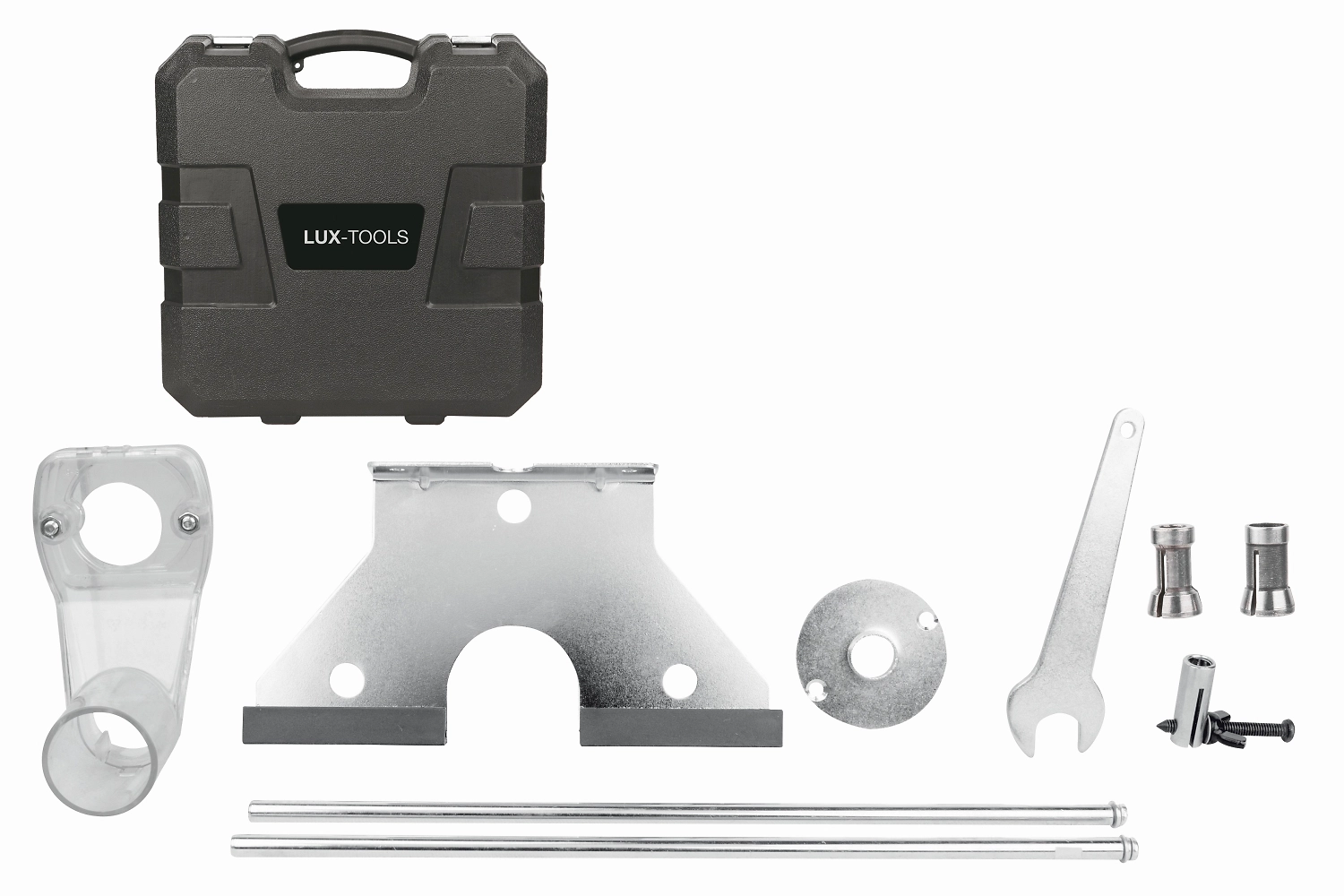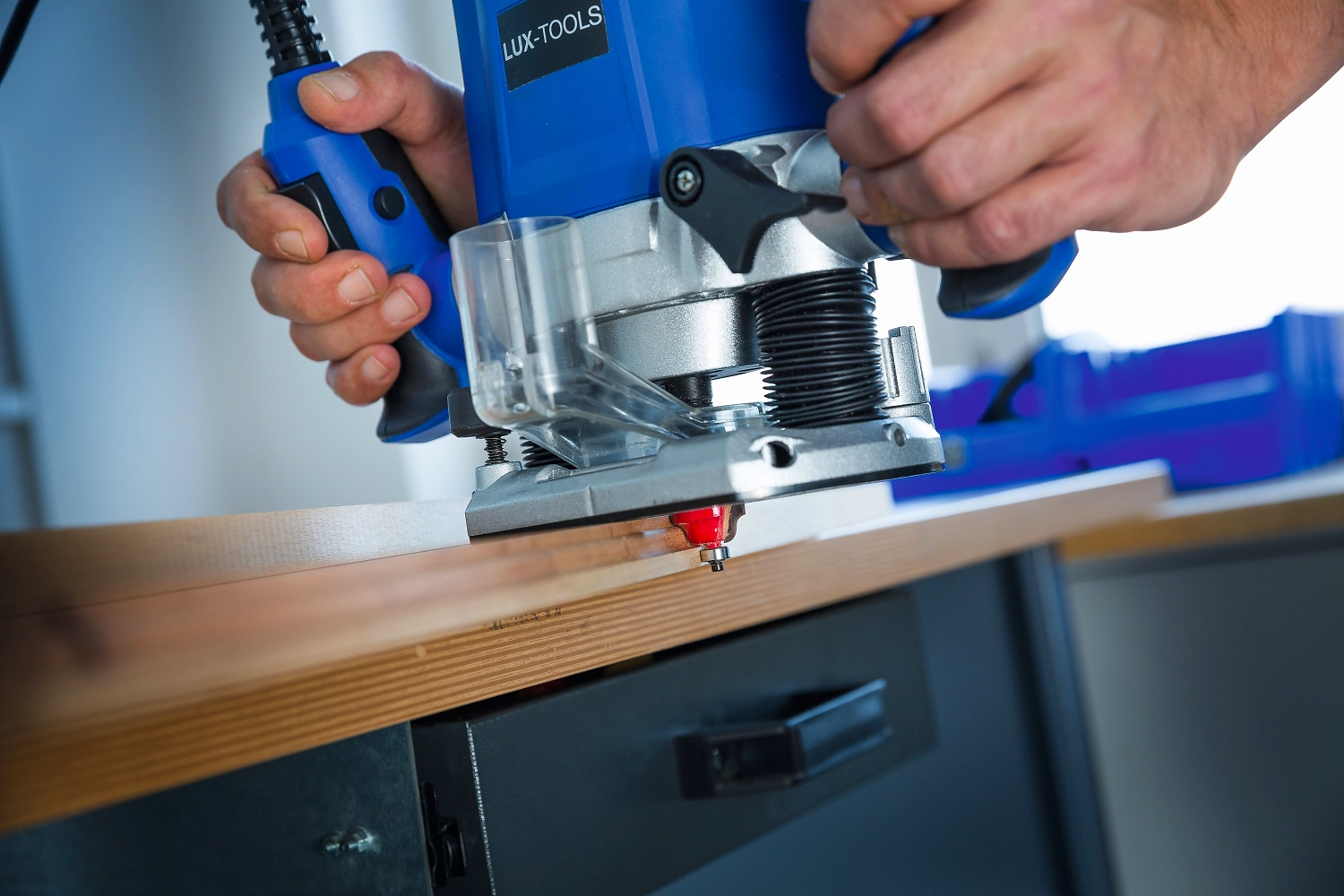 Фрезер электрический LUX-TOOLS 1200 Вт работает от сети и предназначен для всех видов фрезерования. Двигатель перемещается вверх и вниз по направляющим, что позволяет максимально точно регулировать глубину отверстий и пазов.