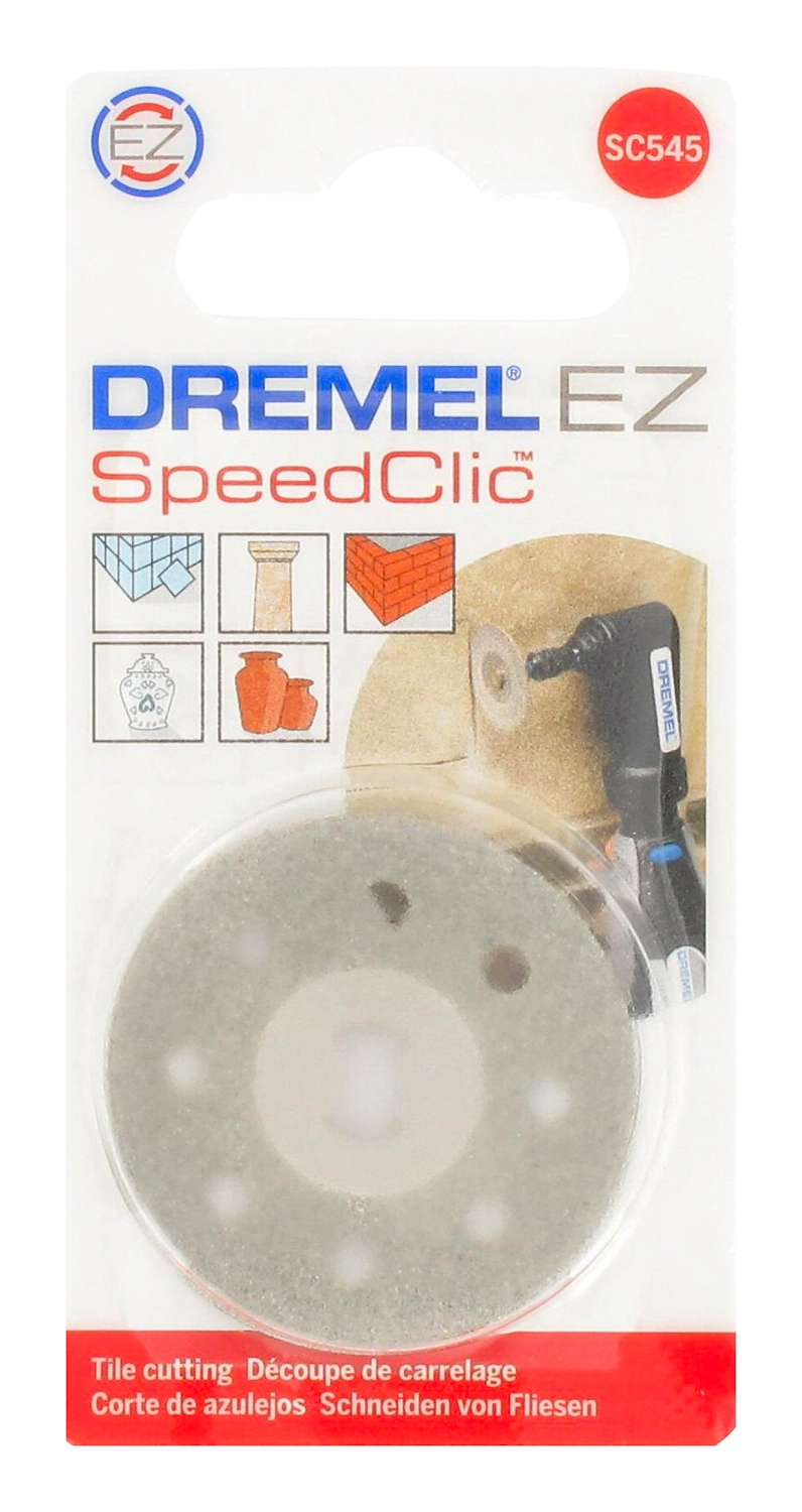 Алмазный отрезной круг Dremel SpeedClic SC545. Уникальный инструмент, специально созданный для резки особо прочных материалов. Это, например, бетон, камень, фарфор, керамика и затвердевшая эпоксидная смола. Алмазный круг обеспечивает точную резку, является очень прочным, не ломается и сохраняет свою форму.