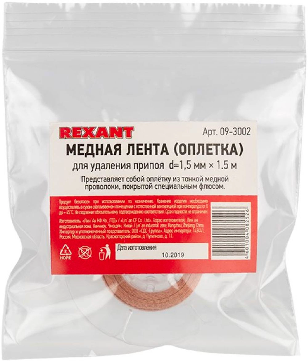 Оплетка для удаления припоя REXANT предназначена для деликатного демонтажа радиокомпонентов с печатных плат при ремонтных работах. Представляет собой оплётку из высококачественной тонкой медной проволоки, покрытой безотмывочным флюсом "RMA".
