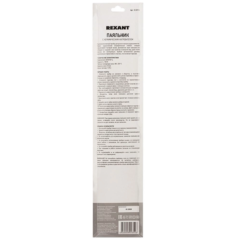 Паяльник с керамическим нагревателем, долговечное жало 100 Вт REXANT предназначен для ручного монтажа радиоэлементов. Его можно использовать как в домашних условиях, так и в профессиональных лабораториях. Паяльник выполнен с керамическим нагревательным элементом, поэтому нагревается быстрее, чем нихромовый и при бережном отношении прослужит много лет. Долговечное жало паяльника состоит из медного сердечника покрытого слоем электролитически осажденного железа. Рабочая часть жала электрохимически покрыта слоем олова (что обеспечивает облуживаемость), а остальная поверхность - хромирована. Такие жала могут при соблюдении ряда предосторожностей работать длительное время без разрушения. Удобная эргономичная рукоятка выполнена из термостойкого пластика с резиновой накладкой, она сделает работу с инструментом легкой и приятной.