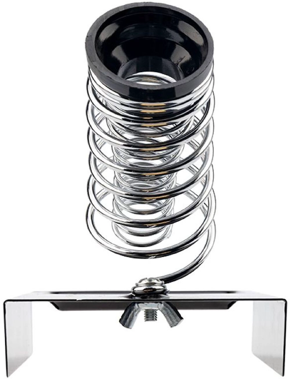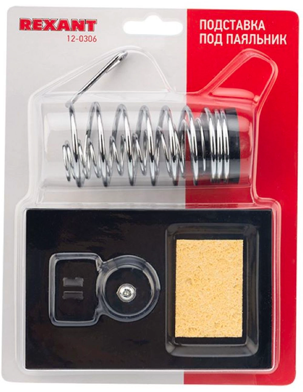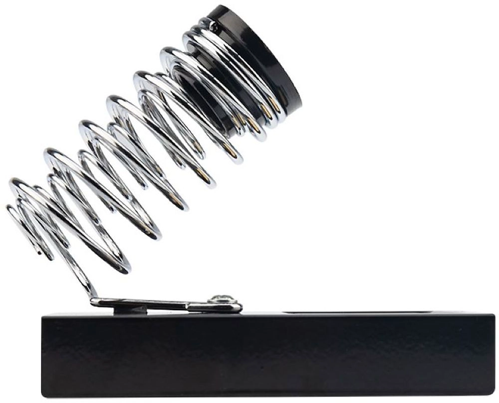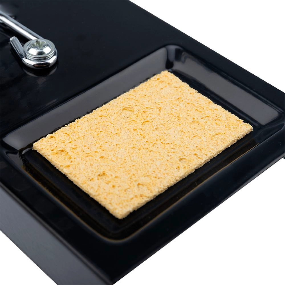 Выполнена из витой хромированной конусообразной пружины и металлической платформы с ложементом под губку для очистки жала паяльника от остатков припоя. Губка для очистки жала паяльника в комплекте.